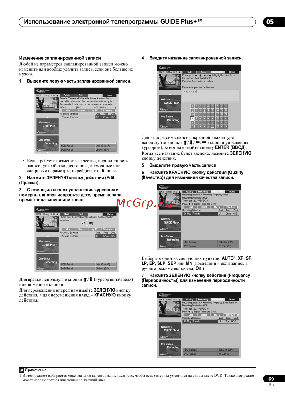 1 В этом режиме выбирается максимальное качество записи для того, чтобы весь материал уместился на одном диске DVD. Также этот режим