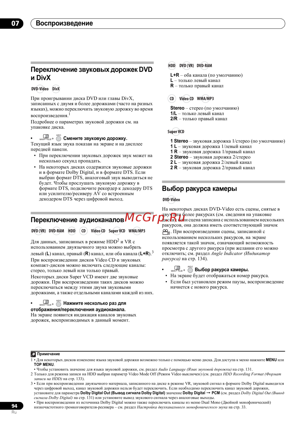 3• Если при воспроизведении двуязычного материала, записанного на диске в режиме VR, звуковой сигнал в формате Dolby Digital выводится