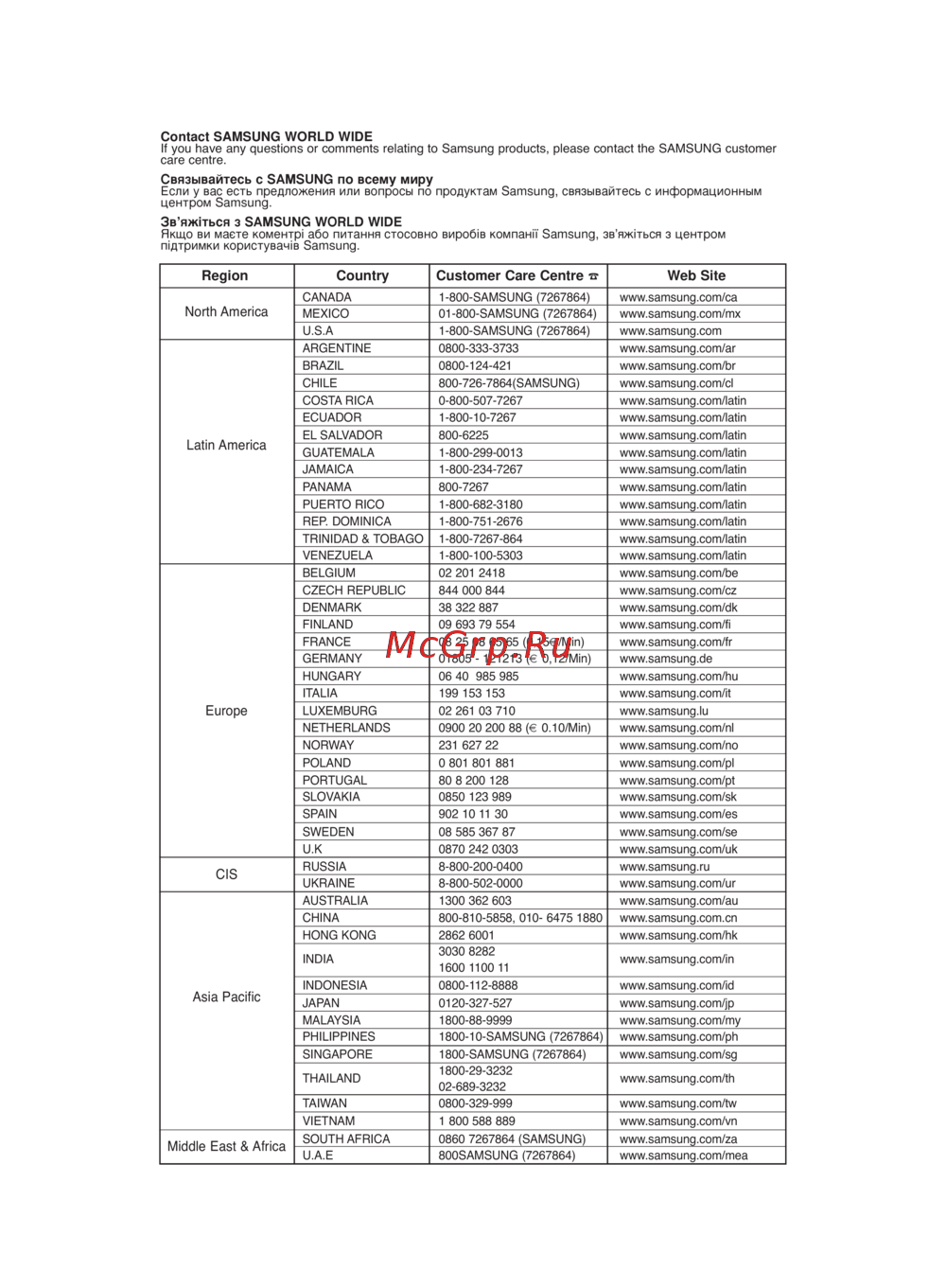 Contact SAMSUNG WORLD WIDE If you have any questions or comments relating to Samsung products please contact the SAMSUNG customer care centre Связывайтесь c SAMSUNG по всему миру Если у вас есть предложения или вопросы по продуктам Samsung связывайтесь с информационным центром Samsung Зв яж1ться з SAMSUNG WORLD WIDE Якщо ви маете коментр або питания стосовно вироб в компанп Samsung зв яж1ться з центром пщтримки користувач в Samsung Region North America Latin America Europe Country Customer Care Centre IT Web Site CANADA 1 800 SAMSUNG 7267864 www samsung com ca MEXICO 01 800 SAMSUNG 7267864 www samsung com mx U S A 1 800 SAMSUNG 7267864 www samsung com ARGENTINE 0800 333 3733 www samsung com ar BRAZIL 0800 124 421 www samsung com br CHILE 800 726 7864 SAMSUNG www samsung com cl COSTARICA 0 800 507 7267 www samsung com latin ECUADOR 1 800 10 7267 www samsung com latin EL SALVADOR 800 6225 www samsung com latin GUATEMALA 1 800 299 0013 www samsung com latin JAMAICA 1 800 234 7267 www samsung com latin PANAMA 800 7267 www samsung com latin PUERTO RICO 1 800 682 3180 www samsung com latin REP DOMINICA 1 800 751 2676 www samsung com latin TRINIDAD TOBAGO 1 800 7267 864 www samsung com latin VENEZUELA 1 800 100 5303 www samsung com latin BELGIUM 02 201 2418 www samsung com be CZECH REPUBLIC 844 000 844 www samsung com cz DENMARK 38 322 887 www samsung com dk FINLAND 09 693 79 554 www samsung com fi FRANCE 08 25 08 65 65 0 15 Min www samsung com fr GERMANY 01805 121213 0 12 Min www samsung de HUNGARY 06 40 985 985 www samsung com hu ITALIA 199 153 153 www samsung com it LUXEMBURG 02 261 03 710 www samsung lu NETHERLANDS 0900 20 200 88 0 10 Min www samsung com nl NORWAY 231 627 22 www samsung com no POLAND 0 801 801 881 www samsung com pl PORTUGAL 80 8 200 128 www samsung com pt SLOVAKIA 0850 1 23 989 www samsung com sk SPAIN 902 10 11 30 www samsung com es SWEDEN 08 585 367 87 www samsung com se U K 0870 242 0303 www samsung com uk RUSSIA 8 800 200 0400 www samsung ru UKRAINE 8 800 502 0000 www samsung com ur AUSTRALIA 1300 362 603 www samsung com au CHINA 800 810 5858 010 6475 1880 www samsung com cn HONG KONG 2862 6001 www samsung com hk CIS 3030 8282 INDIA www samsung com in 1600 1100 11 Asia Pacific INDONESIA 0800 112 8888 www samsung com id JAPAN 0120 327 527 www samsung com jp MALAYSIA 1800 88 9999 www samsung com my PHILIPPINES 1800 10 SAMSUNG 7267864 www samsung com ph SINGAPORE 1800 SAMSUNG 7267864 www samsung com sg 1800 29 3232 THAILAND www samsung com th 02 689 3232 TAIWAN 0800 329 999 www samsung com tw VIETNAM 1 800 588 889 www samsung com vn SOUTH AFRICA 0860 7267864 SAMSUNG www samsung com za U A E 800SAMSUNG 7267864 www samsung com mea Middle East Africa