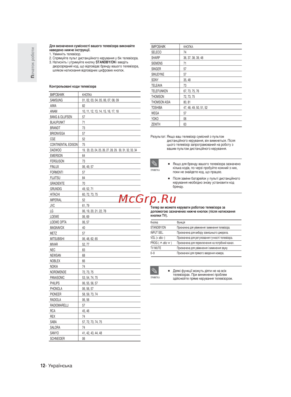 Для визначення сумюносп вашого телев зора виконайте ВИРОБНИК КНОПКА SELECO 74 2 Спрямуйте пульт дистанциного керування у бк телев зора SHARP 36 37 38 39 48 3 Натисыть утримуйте кнопку ЗТАЫОВУЮМI введть SIEMENS 71 SINGER 57 SINUDYNE 57 SONY 35 48 TELEAVA 73 TELEFUNKEN 67 73 75 76 THOMSON 72 73 75 наведено нижче нструкцп 1 Ув1мкнггь телев1зор дворозрядний код що вщповщае бренду вашого телев зора шляхом натискання вщповщних цифрових кнопок Контрольован коди телеввора ВИРОБНИК КНОПКА SAMSUNG 01 02 03 04 05 06 07 08 09 AIWA 82 AN AM 10 11 12 13 14 15 16 17 18 BANG OLUFSEN 57 THOMSON ASIA 80 81 TOSHIBA 47 48 49 50 51 52 WEGA 57 YOKO 06 ZENITH 63 BLAUPUNKT 71 BRANDT 73 BRIONVEGA 57 CGE 52 CONTINENTAL EDISON 75 DAEWOO 19 20 23 24 25 26 27 28 29 30 31 32 33 34 EMERSON 64 FERGUSON 73 FINLUX 06 49 57 FORME NTI 57 FUJITSU 84 Пеля замши батарейок у пулы дистанциного GRADIENTE 70 керування необхщно знову установити код GRUNDIG 49 52 71 HITACHI 60 72 73 75 IMPERIAL 52 JVC 61 79 LG 06 19 20 21 22 78 допомогою зазначених нижче кнопок п юля натискання LOEWE 06 69 кнопки TV LOEWE OPTA 06 57 Кнопка Фуняда MAGNAVOX 40 STANDBY ON финачеи для увиивння I вииивння телевара METZ 57 INPUT SEL Доплачена для вибору зовншнього джерела MITSUBISHI 06 48 62 65 VOL taóo Прикачена для регуловання гучност телеввора PROG л або v Прикачена для переключения на пофбний канал TV MUTE Гфиначенадляувккнення I витнення звуку 0 9 Приначен для пряного введення номера Результат Якщо ваш телев зор сум сний з пультом дистанц1йного керування BÍH вимкнеться Пеля цього телев зор запрограмований на роботу з вашим пультом дистанц1йного керування Якщо для бренду вашого телев зора зазначено галька код1В по черз пробуйте кожний з них поки не знайдете код що працюе бренду MIVAR NEC 52 77 83 NEWSAN 68 NOBLEX 66 NOKIA 74 NORDMENDE 72 73 75 PANASONIC 53 54 74 75 PHILIPS 06 55 56 57 PHONOLA 06 56 57 PIONEER 58 59 73 74 RADIOLA 06 56 Тепер ви можете керувати роботою телеввора за Деям функцп можуть дяти не на BCÍX телев зорах При виникнены проблем RADIOMARELLI 57 RCA 45 46 REX 74 SABA 57 72 73 74 75 SALORA 74 SANYO 41 42 43 44 48 SCHNEIDER 06 12 УкраТнська здйснюйте пряме керування телев зором