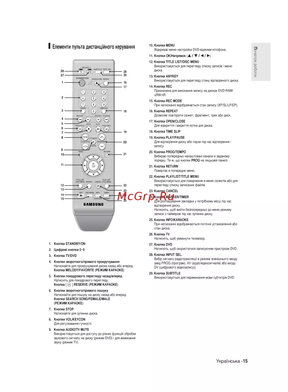 I Елементи пульта дистанщйного керування 10 Кнопка MENU Вщкривас меню настройка 0У0 в1деомагнтофона 11 Кнопки ОК Напрямок 12 Кнопка TITLE L1ST DISC MENU Використовусться для перегляду списку запиав i меню диска 13 Кнопка ANYKEY Використовусться для перегляду стану в дтвореного диска 14 Кнопка REC Призначена для виконання запису на дисках DVD RAM RW R 15 Кнопка REC MODE При натисканы вщображаеться стан запису XP SULP EP 16 Кнопка REPEAT Дозволяв повторити сюжет фрагмент трек або диск 17 Кнопка OPEN CLOSE Для вщкриття i закриття лотка для диска 18 Кнопка TIME SLIP 19 Кнопка PLAY PAUSE Для вщтворення диску або паузи гад час в дтворення запису 20 Кнопки PROG TEMPO Вибирае попередньо налаштован канали в заданому порядку Те ж що кнопки PROG на лицьовй панель 21 Кнопка RETURN Повертае в попередне меню 22 Кнопка PLAYLIST TITLE MENU Використовусться для повернення в меню сюжелв або для перегляду списку записаних файл1в 23 Кнопка CANCEL 24 Кнопка MARKER TIMER Для розташування закладки у потрйному MÍCUÍ nifl час в дтворення диску Натиснпь щоб вийти безпосередньо до меню режиму записи з таймером пщ час зупинки диску 25 Кнопка INFO KARAOKE При натисканы в1дображаються поточи установления або стан диска 26 Кнопка TV Натиснпь щоб ув1мкнути телев1зор 1 Кнопка STAND BY ON 27 Кнопка DVD Натиснпь щоб скористатися записуючим пристроем DVD 2 Цифров кнопки 0 9 28 Кнопка INPUT SEL 3 Кнопка TV DVD Вийр сигналу радютрансляцп в режим зовншнього вводу 4 Кнопки зворотного прямого прокручування вв д PROG програм AV аудю в деосигнал в або входу Натискайте для прокручування диска назад або вперед DV цифрового в деозапису Кнопка MELODY FAVORITE РЕЖИМ КАРАОКЕ 29 Кнопка SUBTITLE 5 Кнопки покадрового перегляду назад вперед Використовусться для перемикання мови субтитр в DVD Натиснть для покадрового перегляду Кнопка RESERVE РЕЖИМ КАРАОКЕ 6 Кнопки зворотного прямого пошуку Натискайте для пошуку на диску назад або вперед Кнопки SEARCH SONG FEMALE MALE РЕЖИМ КАРАОКЕ 7 Кнопка STOP Натискайте для зупинки диска 8 Кнопки VOL KEYCON Для регулювання тучность 9 Кнопка AUDIO TV MUTE Використовусться звукового сигналу ДЛЯ на доступу диску ДО режим piSHHX DVD функщй i для обробки вимикання звуку режим TV УкраТнська 15