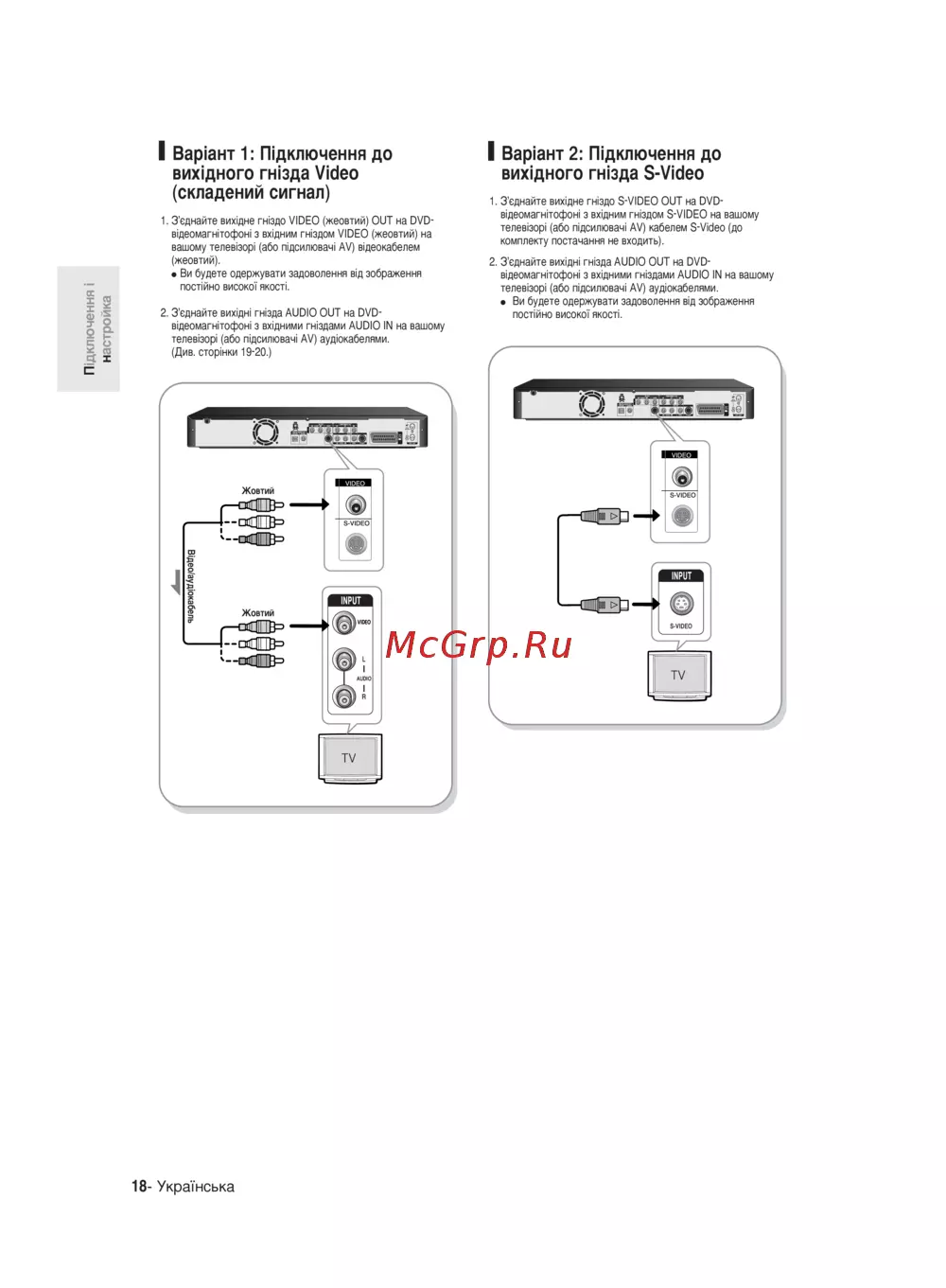 I BapiaHT 1 Пщключення до вихщного гн зда Video складений сигнал 1 З еднайте виядне гнЬдо VIDEO жеовтий OUT на DVDв1деомагнггофон1 з вядним гнедом VIDEO жеовтий на вашему телев1зор або п1дсилювач AV вщеокабелем жеовтий Ви будете одержувати задоволення в д зображення пост йно високоТ якостг I S T s 5 Ct C I BapiaHT 2 Пщключення до вихщного гжзда S Video 1 З еднайте виядне гн здо S VIDEOOUT на DVDв деомагн1тофон1 з вядним гнедом S VIDEO на вашому телев зор1 або п1дсилювач AV кабелем S Video до комплекту постачання не входить 2 З еднайте виядн1 гызда AUDIO OUT на DVDв деомагн1тофон1 з вядними гнидами AUDIO IN на вашому телев зор1 або п1дсилювач AV аудюкабелями Ви будете одержувати задоволення в д зображення 2 З еднайте вих дн1 гызда AUDIO OUT на DVDв деомагнггофон1 з вядними гн здами AUDIO IN на вашему телев зор1 або п1дсилювач AV аудюкабелями Див стор нки 19 20 18 Укранська посийно високоТ якосп