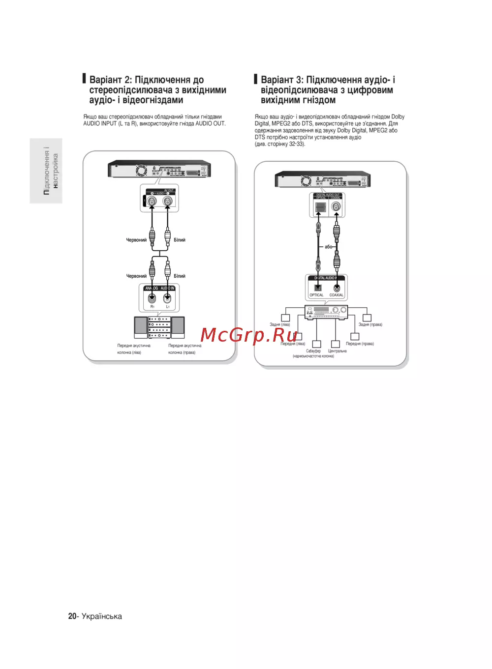 I BapiaHT 2 П1дключення до стереопщсилювача з вихщними ауд1о i в деогн1здами Якщо ваш стереоп1дсилювач обладнаний ильки гыздами AUDIO INPUT L та R використовуйте гн зда AUDIO OUT I BapiaHT 3 П1дключення аудю i вщеопщсилювача з цифровым вих дним гнедом Якщо ваш аудю i видеопщсилювач обладнаний гнедом Dolby Digital MPEG2 або DTS використовуйте це з еднання Для одержания задоволення в д звуку Dolby Digital MPEG2 або DTS потр1бно настроим установления аудю див стор нку 32 33 I S T s 5 Ct C 20 УкраТнська