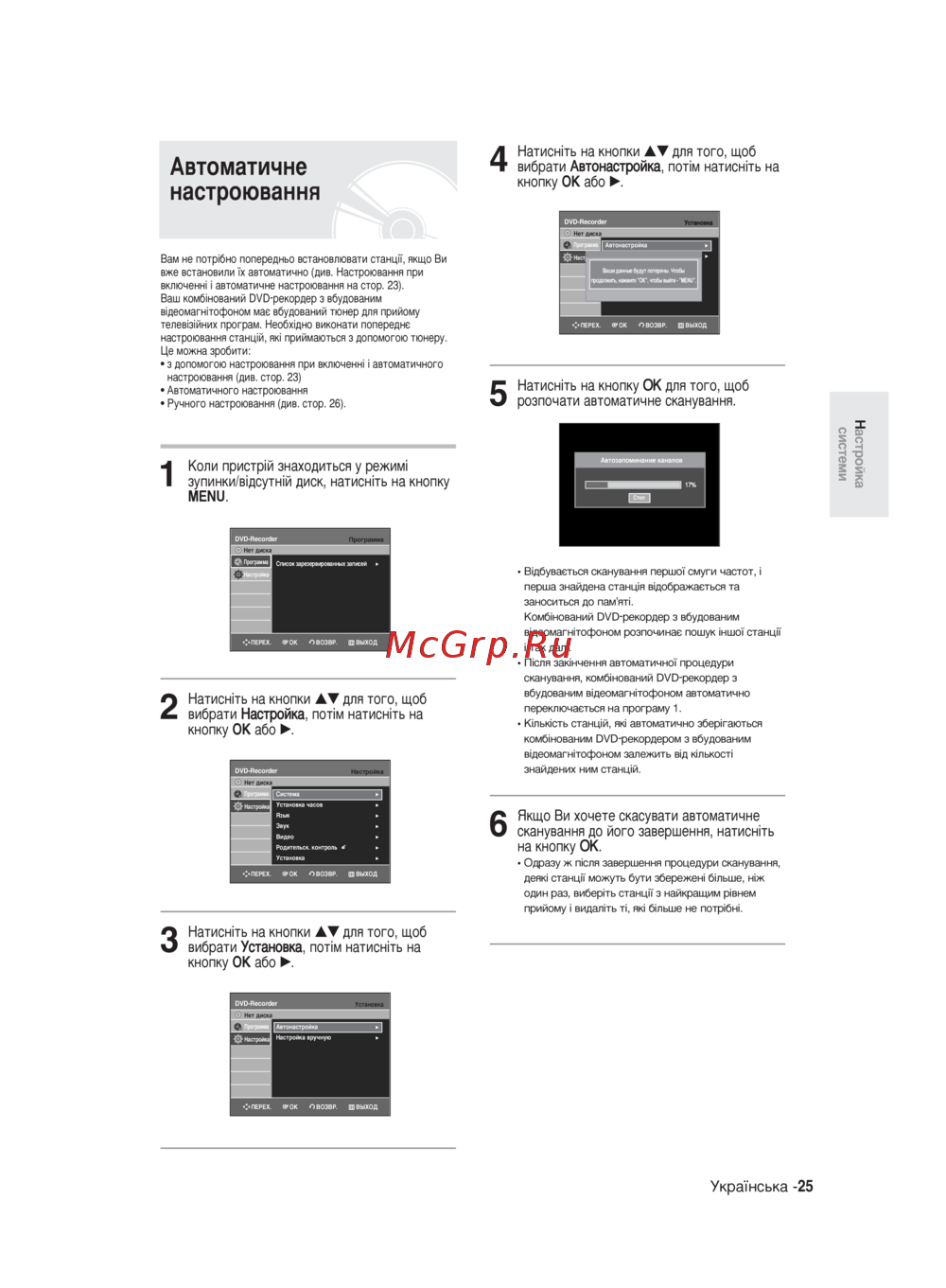 Автоматичне настроювання Натисн ть на кнопки АТ для того щоб вибрати Автонастройка по натиснкь на кнопку ОК або 4 Вам не потр бно попередньо встановлювати станцп якщо Ви вже встановили Тх автоматично див Настроювання при включены автоматичне настроювання на стор 23 Ваш комб1нований ОУО рекордер з вбудованим в деомагн тофоном мае вбудований тюнер для прийому телев з йних програм Необхщно виконати попереднс настроювання станц й яю приймаються з допомогою тюнеру Цеможна зробити з допомогою настроювання при включены автоматичного настроювання див стор 23 Автоматичного настроювання Ручного настроювання див стор 26 Натисн ть на кнопку ОК для того щоб розпочати автоматичне сканування 5 о5 2 Коли пристр й знаходиться у режим зупинки вщсутнм диск натисн ть на кнопку MENU И 1 S О Вщбуваеться сканування першоТ смуги частот перша знайдена станц я вщображаеться та заноситься до пам яп Комб нований ОУО рекордер з вбудованим в деомагн тофонэм розпочинае пошук ншоТ станцп так дал П сля зак нчення автоматичноТ процедури сканування комб нований ОУО рекордер з вбудованим в деомагн тофонэм автоматично Натисн ть на кнопки АТ для того щоб вибрати Настройка попм натисн ть на кнопку ОК або 2 переключаеться на програму 1 Юльксть станцй як автоматично эбер гаються комб нованим ОУО рекордером з вбудованим в деомагн тофонэм залежить в д к лькост знайдених ним станцй 6 Якщо Ви хочете скасувати автоматичне сканування до його завершения натисн ть на кнопку ОК Одразу ж п сля завершения процедури сканування деяк станцп можуть бути эбережен б льше н ж один раз вибер ть станцп з найкращим р внем грийому видал ть т ж б льше не потр бн З Натисн ть на кнопки АТ для того щоб вибрати Установка по натиснпь на кнопку ОК або УкраТнська 25