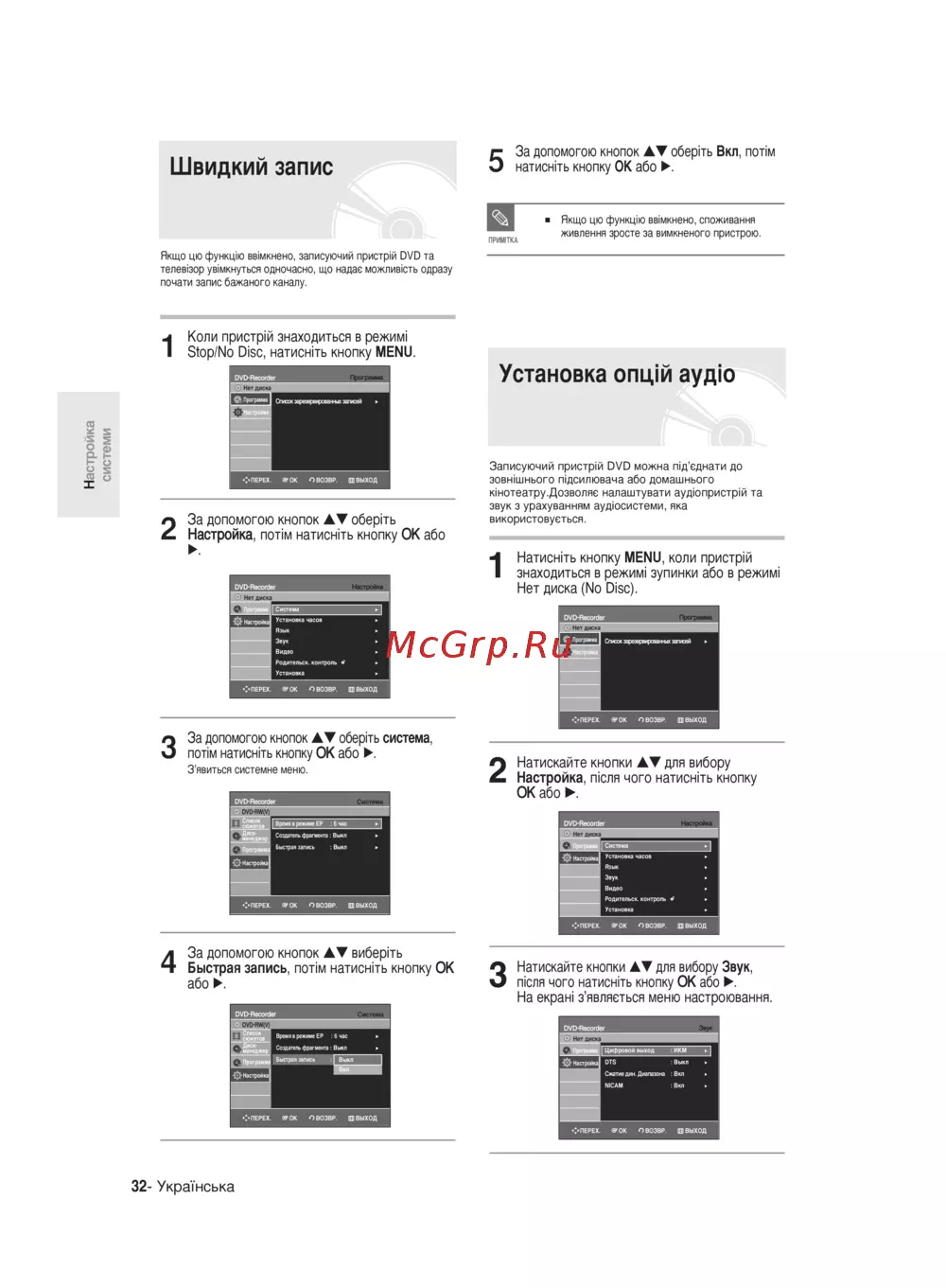 Швидкий запис 3а допомогою кнопок АТ оберпъ Вкл полм натисниь кнопку ОК або 5 Якщо цю функщю ввмкнено споживання ПРИМПХА живлен ня зросте за вимкненого пристрою Якщо цю функц1Ю вв1мкнено записуючий пристр1й DVD та телев1зор ув1мкнуться одночасно що надае можливють одразу печати запис бажаного каналу Установка опцт аудю Записуючий пристр1й DVD можна п д сднати до зовншнього пщеилювача або домашнього инотеатру Дозволяе налаштувати аудюпристр1й та звук з урахуванням ауд осистеми яка 2 3а допомогою кнопок АТ оберпь Настройка полм натисыть кнопку ОК або використовусться Натисн1ть кнопку MENU коли пристр й знаходиться в режим1 зупинки або в режим1 Нет диска No Disc 1 З 3а допомогою кнопок АТ оберггь система полм натиенть кнопку ОК або 4 3а допомогою кнопок АТ виберпъ Быстрая запись полм натиенпь кнопку ОК або З явиться системна меню 32 УкраТнська 2 Натискайте кнопки АТ для вибору Настройка пюля чого натисыть кнопку ОК або 3 Натискайте кнопки АТ для вибору Звук пюля чого натисн ть кнопку ОК або На екран з являеться меню настроювання