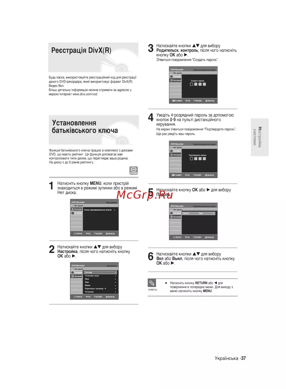 3 Реестрацт DivX R Натискайте кнопки АТ для вибору Родительск контроль пюля чого натисн ть кнопку ОК або З явиться пов домлення Создать пароль Будь ласка використовуйте реестрафйний код для реестрацп даного DVD рекордера який використовуе формат DivX R Видео Вкл Б льш детальну нформац Ю можна отримати за адресою у мереж lHrepHeTwww divx com vod Увед ть 4 розрядний пароль за допомогою кнопок 0 9 на пульт дистанц йного керування 4 Установления батьювського ключа На екраи з явиться пов домлення Подтвердите пароль о5 Ще раз уведть ваш пароль 2 И S О Функця батьювського ключа працюс в комплекс з дисками DVD що мають рейтинг Ця функц я допомагае вам контролювати типи диск в що переглядас ваша родина На диску е до 8 piBH в рейтингу га Натисниь кнопку MENU коли пристр й знаходиться в режим зупинки або в режим Нет диска 1 2 Натискайте кнопки АТ для вибору Настройка пюля чого натисн ть кнопку ОК або 5 6 Натискайте кнопку ОК або для вибору Пароль Натискайте кнопки АТ для вибору Вкл або Выкл пюля чого натисниь кнопку ОК або Натисить повернення ПРИМТСА кнопку в RETURN попередне або меню для Для виходу з меню натисить кнопку MENU УкраТнська 37