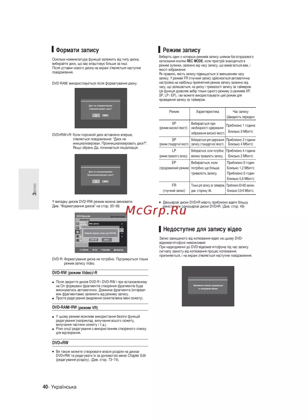 I Формати запису Режим запису Виберггь один з чотирьох режим в запису шляхом багатораэового Оскшьки номенклатура функфй залежить вщ типу диска натискання кнопки REC MODE коли пристрй знаходиться в вибирайте диск що вас влаштовуе йльше за нш режим зупинки залежно в д часу запису що вимагасться в ам Пеля уставки нового диска на екран з являсться наступив якост зображення пов домлення RK правило яюсть запису пщвищусться si зменшенням часу запису У режим FR гнучкий запис зд йснюеться автоматична настройка на найбтьш прийнятний режим запису залежно в д DVD RAM використовусться п сля форматування диску часу що залишасться на диску тривалост запису за таймером Ця функц я дозволяе виб р Tinьки одного режиму з режим в ХР SP LP ЕР i ви можете використовувати цей режим для проведения запису за таймером Режим Характеристика Час запису Швидюсть передач ХР фежтш в исокоТ якост Вибирасться при необхщност одержания зображення високоТ тост DVD RW R Коли порожни диск вставлено вперше з являсться пов домлення Диск не SP инициализирован Проинициализировать диск Приблизно 1 година Близько 8 Мбит с Вибирасться для одержания Приблизно 2 години реж м стандарт ног якост запису стандарт но жосп Близько 4 Мбит с Якщо обрано Да починаеться н ц ал зац я LP Вибирасться коли гютрбна Приблизно 4 години реж и тривагюго запгюу велика тривалсть запису ЕР про до вже ний режим Близько 2 Мбит с Вибирасться коли Приблизно 6 годин потр бно ще б льша Близько 1 2 Мбит с тривал сть запису Приблизно 8 годин Близько 0 8 Мбит с FR гнучкий запис У випадку дисюв DVD RW режим можна зм нювати Приблизил 60 480 хеипин Титьки для запису за таймер див сторнгу 46 Близько 0 8 8 Мбит с ДBOLuapoei диски DVD R мають приблизно вдв ч б льшу Див Форматування дисюв на стар 85 86 емнють н ж одношаров диски DVD R Див crop 49 Недоступне для запису вщео Запис захищеного вщ коп ювання в део на цьому DVDв деомагнггофон неможливий При надходженн до ОУО в деомагнггофона пщ час запису сигналу захисту вщ коп ювання процес коыювання припинясться на екран з являсться наступив пов домлення DVD R Форматування диска не потр бно Пдтримуеться ильки режим запису Video DVD RW режим Video AR____________________________________________ Пеля закриття дисюв DVD R i DVD RW i при встановленому на On формувач фрагменте створення фрагменте буде виконуватись автоматично Довжина фрагмента нтервал м ж фрагментами залежить Biд режиму запису Просте редагування видалення сюжепвзмша мен сюжету DVD RAM RW режим VR У цьому режим можливе використання безл ч функфй редагування наприклад вилучання всього сюжету вилучання частини сюжету i тд Pi3Hi опцп редагування з використанням створеного списку для вщтворення DVD RW Ви також можете створювати власы роздюи на дисках DVD RW та редагувати ix за допомогою меню Chapter Edit редагування роздлу Див crop 73 74 40 УкраТнська