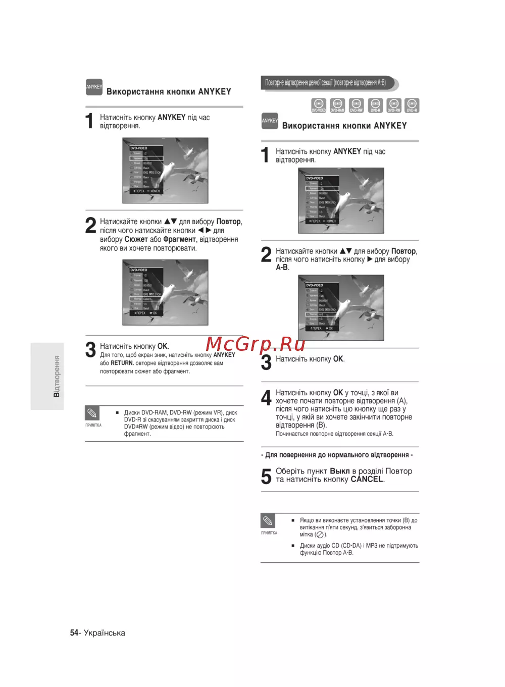Повторне вщтворення дежо сад повторне вщтворення А В I Використання кнопки ANYKEY rgi Egi Kgl Kgl Kgl Натиснпь кнопку ANYKEY nifl час вщтворення 1 AT EV Використання кнопки ANYKEY Натисниь кнопку ANYKEY nifl час вщтворення 1 2 Натискайте кнопки АТ для вибору Повтор п сля чого натискайте кнопки для вибору Сюжет або Фрагмент вщтворення якого ви хочете повторювати 2 Натискайте кнопки АТ для вибору Повтор пюля чого натиснпъ кнопку для вибору А В Натисниь кнопку ОК Для того щоб екран зник нагноить кнопку ANYKEY X або RETURN овторне вщтворення дозволяв вам g о co повторювати сюжет або фрагмент ä m Натисниь кнопку ОК Натисн ть кнопку ОК у точц з яко ви хочете почати повторне вщтворення А пюля чого натиснпъ цю кнопку ще раз у точцг у яюй ви хочете заюнчити повторне вщтворення В 4 Диски DVD RAM DVD RW режим VR диск DVD R 3i скасуванням закриття диска i диск ПИМПХА DVD RW режим вщео не повторюють фрагмент Починасться повторне вщтворення секцп А В Для повернення до нормального вщтворення 0бер1ть пункт Выкл в розд ni Повтор 5 та натисн ть кнопку CANCEL Якщо ви виконаете установления точки В до ШИИТКА вникания п яти секунд з явиться заборонна мпка 0 Диски аудю CD CD DA i MP3 не пщтримують функфю Повтор А В 54 УкраТнська