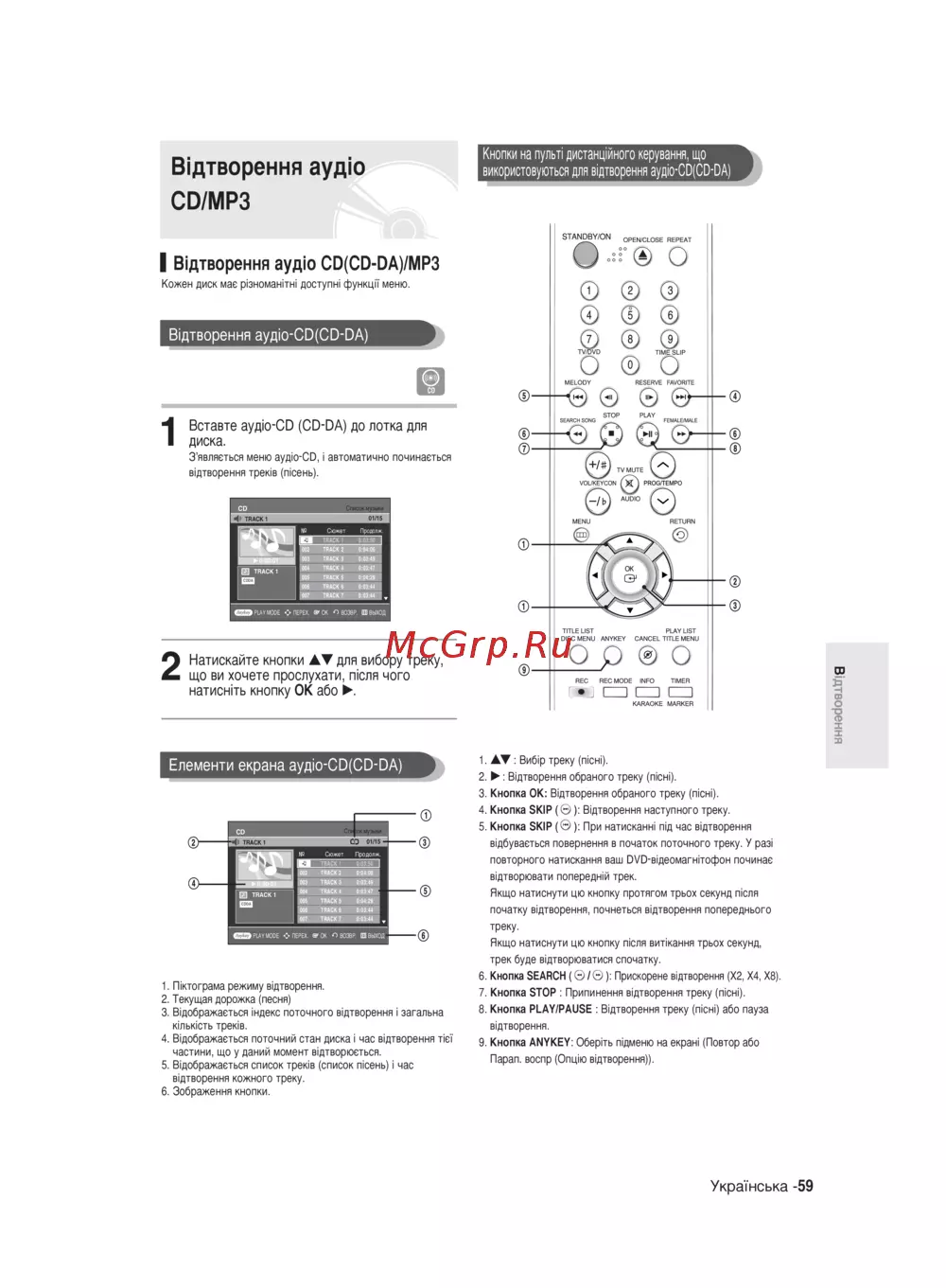 Дізнайтеся, як правильно відтворювати аудіо-CD та MP3 треки за допомогою пульта дистанційного керування. Просте меню та зручні кнопки для вибору треків.