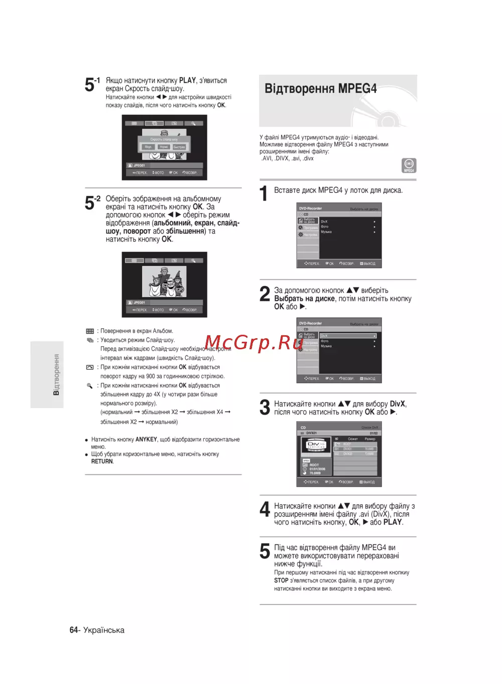 1 Якщо натиснути кнопку PLAY з явиться екран Скрость слайд шоу 5 Вщтворення MPEG4 Натискайте кнопки 4 для настройки швидкост показу слайда деля чого натисыть кнопку ОК У файл MPEG4 утримуються аудю i в деодан Можливе в дтворення файлу MPEG4 з наступними розширеннями мен файлу AVI DIVX avi divx Вставте диск MPEG4 у лоток для диска 2 Оберпъ зображення на альбомному екран та натисыть кнопку ОК За допомогою кнопок оберпъ режим воображения альбомний екран слайдшоу поворот або збтьшення та натиенпъ кнопку ОК 5 2 3а допомогою кнопок АТ виберть Выбрать на диске попм натиенпъ кнопку ОК або 3 Натискайте кнопки АТ для вибору DivX пюля чого натисыть кнопку ОК або та Повернення в екран Альбом Уводиться режим Слайд шоу Перед актив зац сю Слайдшоу необидно настроим нтервал м ж кадрами швидюсть Слайдшоу X g о m m И При кожым натисканы кнопки ОК в дбувасться поворот кадру на 900 за годинниковою строкою При кожым натисканы кнопки ОК в дбувасться збтьшення кадру до 4Х у чотири рази бтьше нормального розмфу нормальний збтьшення Х2 збтьшення Х4 збтьшення Х2 нормальний Натисыть кнопку ANYKEY щоб в добразити горизонтальна меню Щоб убрати коризонтальне меню натисыть кнопку RETURN 4 Натискайте кнопки АТ для вибору файлу з розширенням мен файлу avi DivX п сля чого натисыть кнопку ОК або PLAY Пщ час вщтворення файлу MPEG4 ви можете використовувати перерахован нижче функцп 5 При першому натисканы пф час вфтворення кнопкиу STOP з являсться список файл в а при другому натисканы кнопки ви виходите з екрана меню 64 УкраТнська