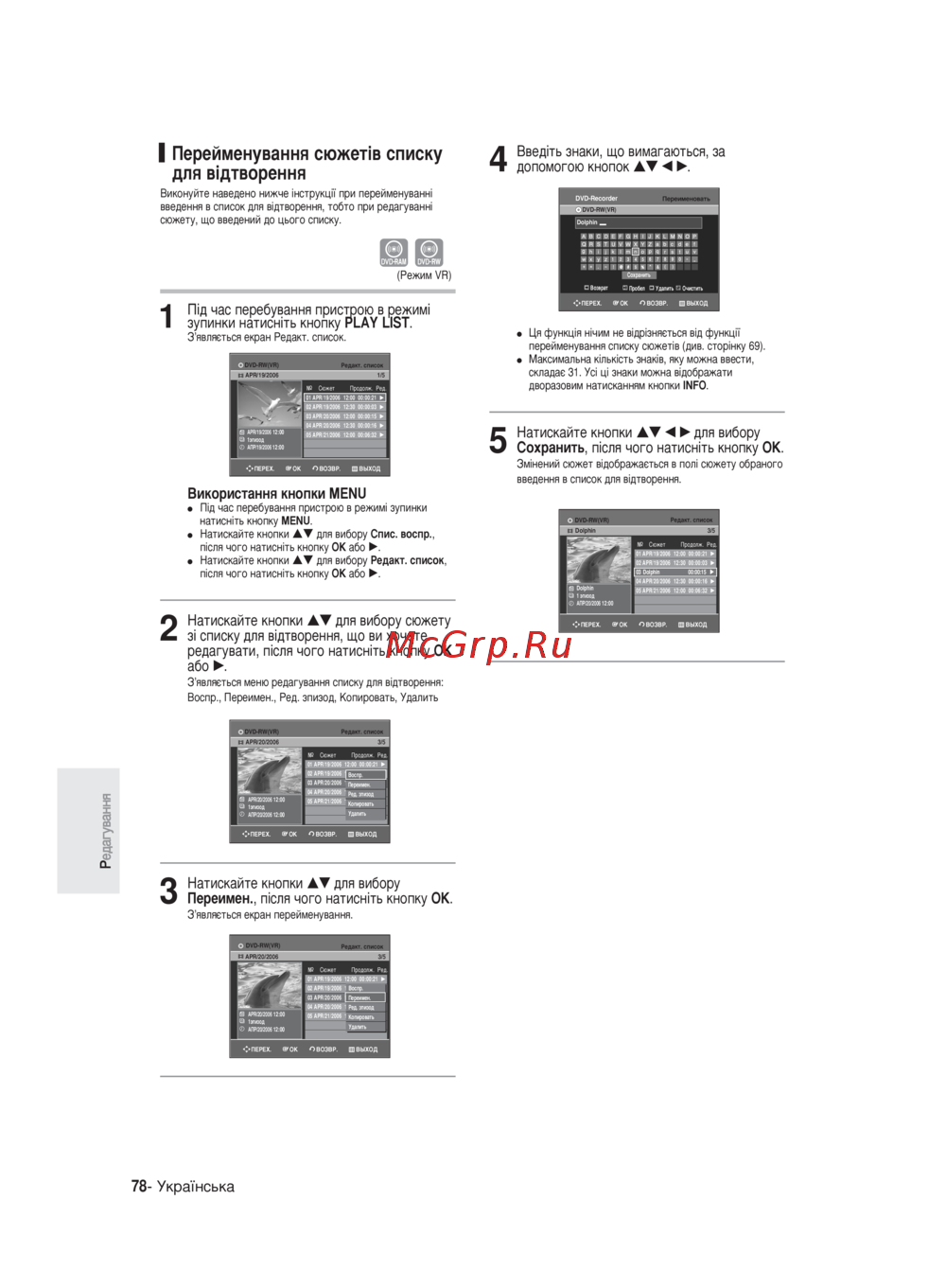 Перейменування сюжетю списку для вщтворення Введпъ знаки що вимагаються за допомогою кнопок АТ 4 Виконуйте наведено нижче нструкцп при перейменувани введения в список для вщтворення тобто при редагувани сюжету що введений до цього списку Режим VR ni д час перебування пристрою в режим зупинки натиснпъ кнопку PLAY LIST I Ця функц я ичим не в1др1знясться в д функцй З являсться екран Редакт список перейменування списку сюжете див сторнку 69 Максимальна юлькють знаюв яку можна ввести складае 31 Ус ф знаки можна в дображати дворазовим натисканням кнопки INFO 5 Натискайте кнопки АТ для вибору Сохранить пюля чого натисн ть кнопку ОК Зм нений сюжет вщображаеться в пол сюжету обраного введения в список для вщтворення Використання кнопки MENU Пщ час перебування пристрою в режим зупинки натисн ть кнопку MENU Натискайте кнопки АТ для вибору Спис воспр теля чого натисыть кнопку ОК або Натискайте кнопки АТ для вибору Редакт список теля чого натисыть кнопку ОК або 2 Натискайте кнопки АТ для вибору сюжету а списку для вщтворення що ви хочете редагувати псля чого натиснпъ кнопку ОК або З являсться меню редагування списку для в1дтворення Воспр Переимен Ред эпизод Копировать Удалить 3 Натискайте кнопки АТ для вибору Переимен пюля чого натисниь кнопку ОК З являсться екран перейменування 78 УкраТнська