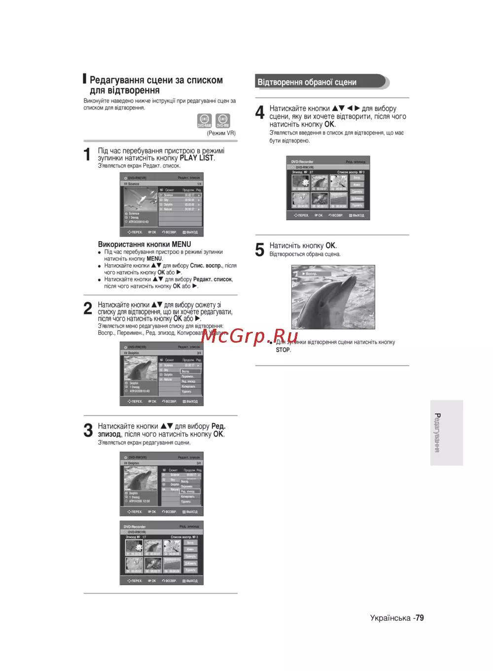 I Редагування сцени за списком Вщтворення об рано сцени для в дтворення Виконуйте наведено нижче нструкцн при редагуванн сцен за списком для в дтворення ИЗ О Режим V R 4 Натискайте кнопки АТ для вибору сцени яку ви хочете вщтворити пюля чого натиенпь кнопку ОК З являеться введения в список для вщтворення що мае бути вщтворено Пщ час перебування пристрою в режим зупинки натисн ть кнопку PLAY LIST 1 З являеться екран Редакт список Використання кнопки MENU Натисниь кнопку ОК Пщ час перебування пристрою в режим зупинки Вщтворюеться обрана сцена натисить кнопку MENU Натискайте кнопки АТ для вибору Спис воспр пюля чого натисыть кнопку ОК або Натискайте кнопки АТ для вибору Редакт список пюля чого натисыть кнопку ОК або 2 Натискайте кнопки АТ для вибору сюжету з списку для в дтворення що ви хочете редагувати пюля чого натиснпъ кнопку ОК або З являеться меню редагування списку для вщтворення Воспр Переимен Ред эпизод Копировать Удалить Для зупинки вщтворення сцени натисыть кнопку STOP 3 Натискайте кнопки АТ для вибору Ред эпизод пюля чого натиснпь кнопку ОК З являеться екран редагування сцени 5 УкраТнська 79