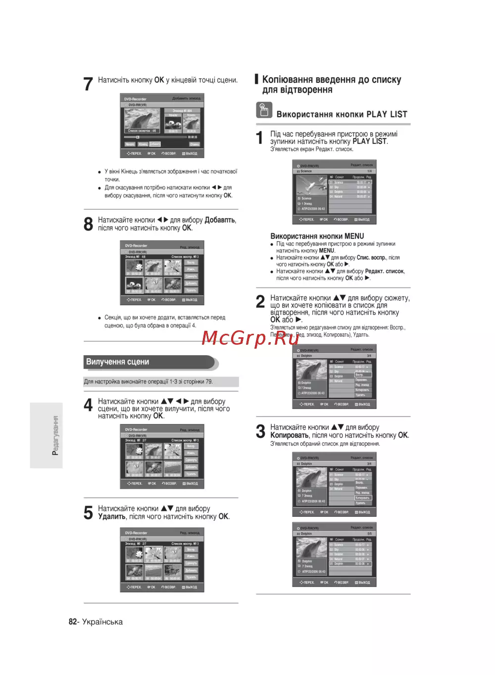 I Коглювання введения до списку для в дтворення Натиснпь кнопку ОК у к нцев й точц оцени Використання кнопки PLAY LIST Пщ час перебування пристрою в режим зупинки натисн ть кнопку PLAY LIST 1 У eiKHi Кнець з являеться зображення i час З являеться екран Редакт список початковоТ точки Для скасування потрбно натискати кнопки для вибору скасування теля чого натиснути кнопку ОК Використання кнопки MENU Пщ час перебування пристрою в режим зупинки натиенпъ кнопку MENU Натискайте кнопки АТ для вибору Спис воспр теля чого натиенпъ кнопку ОК або Натискайте кнопки АТ для вибору Редакт список П1сля чого натисить кнопку ОК або 2 Секщя що ви хочете додати вставлясться Натискайте кнопки АТ для вибору сюжету що ви хочете копювати в список для адтворення июля чого натиенпь кнопку перед сценою що була обрана в операцп 4 З являеться меню редагування списку для вщтворення Воспр Переилен Ред эпизод Копировать Удалть Вилучення сцени Для настройка виконайте операцп 1 3 3i сторнки 79 4 Натискайте кнопки АТ для вибору сцени що ви хочете вилучити июля чого натиенть кнопку ОК 3 5 Натискайте кнопки АТ для вибору Удалить псля чого натиенпъ кнопку ОК 82 УкраТнська Натискайте кнопки АТ для вибору Копировать пюля чого натисн ть кнопку ОК З являеться обраний список для вщтворення