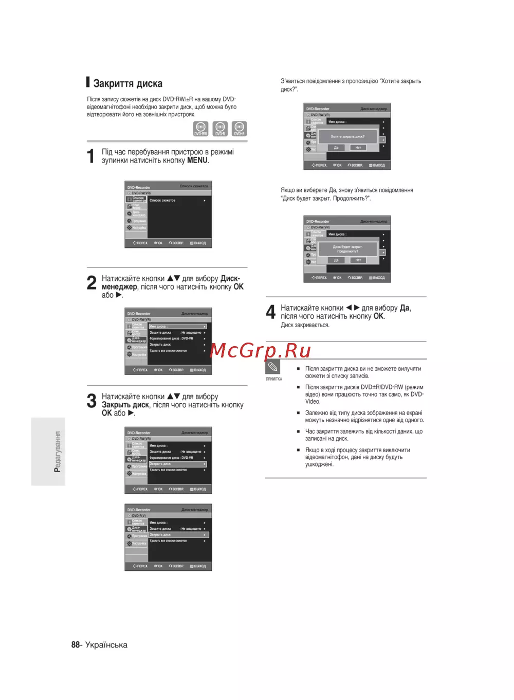 I Закриття диска З явиться пов домлення з пропозищею Хотите закрыть диск Пеля запису сюжета на диск DVD RW R на вашему DVDвдеомагнпофон необидно закрити диск щоб можнабуло вщтворювати його на зовн1ШН1х пристроях Imfl ЕЗл CuJ ni д час перебування пристрою в режим1 зупинки натиенпъ кнопку MENU I Якщо ви виберете Да знову з явиться пов домлення Диск будет закрыт Продолжить 2 Натискайте кнопки АТ для вибору Дискменеджер псля чого натиенпъ кнопку ОК або 4 Натискайте кнопки для вибору Да псля чого натиенть кнопку ОК Диск закриваеться Псля закриття диска ви не зможете вилучяти сюжети 3i списку запиав Псля закриття дисгав DVD R DVD RW режим 3 Натискайте кнопки АТ для вибору Закрыть диск псля чого натиенпъ кнопку ОК або в део вони працюють точно так само як DVDVideo Залежно вщ типу диска зображення на екран можуть незначно в др1знятися одне вщ одного Час закриття залежить ei д Ki лькосп даних що записан на диск Якщо в ход процесу закриття виключити в1деомагнпофон дан на диску будуть ушкоджень 88 УкраТнська