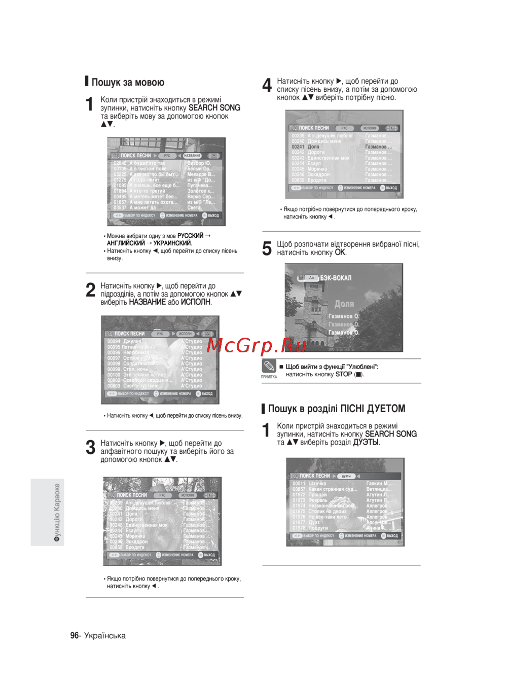 1 Пошук за мовою Ч Коли пристр й знаходиться в режим1 зупинки натиснпь кнопку SEARCH SONG та виберть мову за допомогою кнопок АТ Л Натиснпь кнопку щоб перейти до Ч списку niceHb внизу а попм за допомогою кнопок АТ виберпь потр бну пюню 00241 Доля 1 j MiIsM С Газманов ff НАЗВАНИЕМ АД Якщо потр бно повернутися до попереднього кроку натисыть кнопку Можна вибрати одну з мов РУССКИЙ АНГЛИЙСКИЙ УКРАИНСКИЙ Натисыть кнопку Ч щоб перейти до списку П1сень Е Щоб розпочати вщтворення вибрано nicHi О натисн ть кнопку ОК внизу Q Натиснть кнопку щоб перейти до niдрозд а по за допомогою кнопок АТ виберть НАЗВАНИЕ або ИСПОЛН Д1ж Ml Щоб вийти э функцп УлюбленГ nmma натисыть кнопку STOP Пошук в розд1л1 П1СН1 ДУЕТОМ Натиснггь кнопку Ч щоб перейти до списку пюень внизу Q Натисн1ть кнопку щоб перейти до О алфав тного пошуку та виберпъ його за допомогою кнопок АТ я 2 И Коли пристр й знаходиться в pexnMi зупинки натиснпь кнопку SEARCH SONG та АТ вибер ть роздт ДУЭТЫ РИ Ж сполн Ц г 3 1 а 21 еН МИИйД__________ ______________ 1 е Якщо потрбно повернутися до попереднього кроку натисыть кнопку 96 УкраТнська