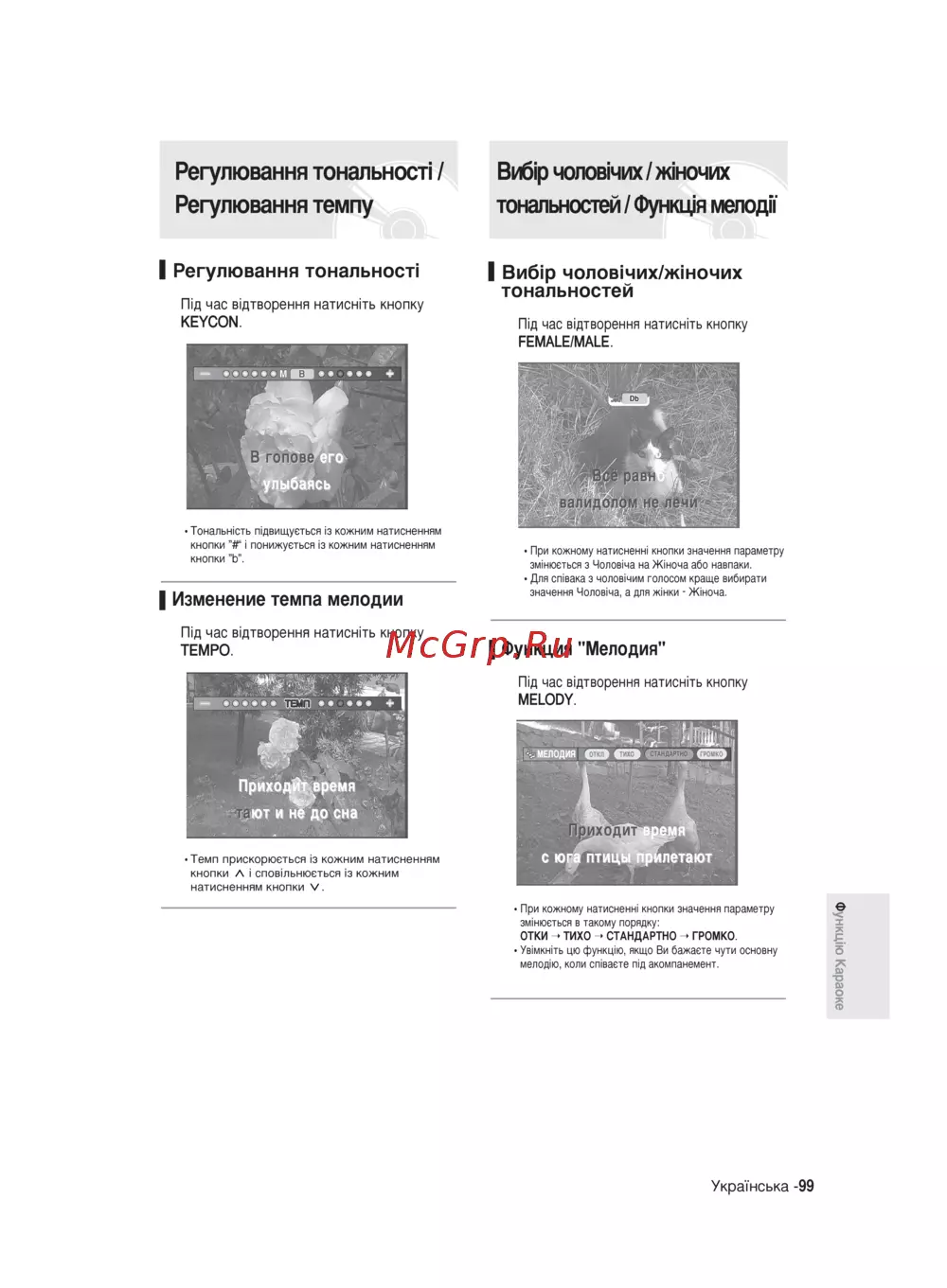 Регулювання тональност Вибр чолов чих ж ночих Регулювання темпу тональностей Функц я мелодп I Регулювання тональност I Виб р чолов чих ж ночих тональностей Пщ час вщтворення натиенпь кнопку KEYCON Пщ час вщтворення натиемть кнопку FEMALE MALE Тональнють пщвищуеться 3 кожним натисненням кнопки понижуеться 3 кожним натисненням кнопки Ь При кожному натисненн кнопки значения параметру зм1нюсться з Чолов1ча на Ж ноча або навпаки Для сп вака з чолов1чим голосом краще вибирати Изменение темпа мелодии значения Чолов1ча а для ж нки Ж ноча Пщ час вщтворення натиенпь кнопку TEMPO Функция Мелодия Пщ час вщтворення натиемть кнопку MELODY Темп прискорюеться 3 кожним натисненням кнопки л I сповшьнюеться 3 кожним натисненням кнопки V При кожному натиснени кнопки значения параметру зм1нюсться в такому порядку ОТКИ ТИХО СТАНДАРТНО ГРОМКО Ув1мкнпь цю фунадю якщо Ви бажаете чути основну мелодю коли сп1васте пщ акомпанемент б о о УкраТнська 99
