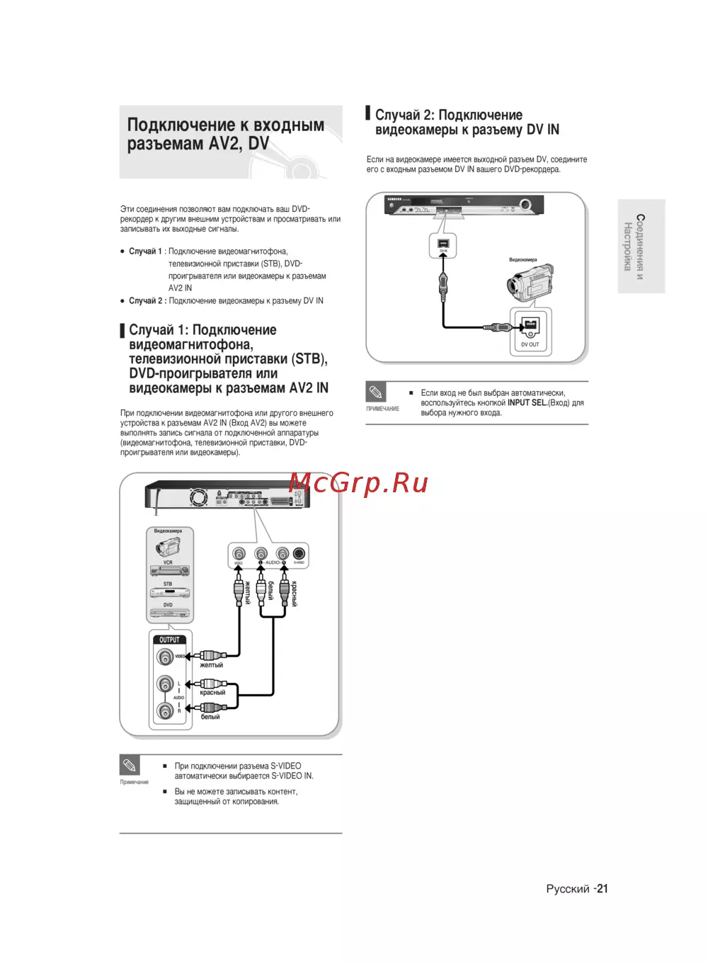 Подключение к входным разъемам AV2 DV I Случай 2 Подключение видеокамеры к разъему ОУ 1М Если на видеокамере имеется выходной разъем ОУ соедините его с входным разъемом ОУ 1Ы вашего ОУО рекордера Эти соединения позволяют вам подключать ваш 0У0рекордер к другим внешним устройствам и просматривать или записывать их выходные сигналы Случай 1 Подключение видеомагнитофона телевизионной приставки ЭТВ ОУОпроигрывателя или видеокамеры к разъемам АУ21Ы Случай 2 Подключение видеокамеры к разъему ОУ 1Ы Случай 1 Подключение видеомагнитофона телевизионной приставки БТВ ОУО проигрывателя или видеокамеры к разъемам АУ21М Если вход не был выбран автоматически воспользуйтесь кнопкой INPUT SEL Bxofl для При подключении видеомагнитофона или другого внешнего ПРИМЕЧАНИЕ выбора нужного входа устройства к разъемам АУ21Ы Вход АУ2 вы можете выполнять запись сигнала от подключенной аппаратуры видеомагнитофона телевизионной приставки 0У0проигрывателя или видеокамеры При подключении разъема Э УЮЕО Приме ние автоматически выбирается Э УЮЕО М Вы не можете записывать контент защищенный от копирования Русский 21