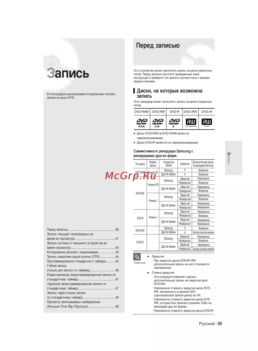 Samsung DVD-R140 MK — инструкции по записи на диски DVD: типы и совместимость [39/216]