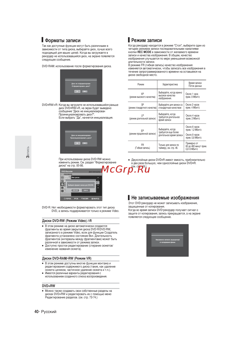 I Форматы записи I Режим записи Так как доступные функции могут быть различными в Когда рекордер находится в режиме Стоп выберите один из зависимости от типа диска выбирайте диск лучше всего четырех режимов записи последовательными нажатиями подходящий для ваших целей Когда вы загружаете в кнопки REC MODE в зависимости от желаемого времени рекордер не использовавшийся диск на экране появляется записи и качества изображения В общем качество следующее сообщение изображения улучшается по мере уменьшения возможной длительности записи DVD RAM использование после форматирования диска В режиме FR гибкая запись качество изображения изменяется автоматически чтобы записать все изображения в течение запрограммированного времени на оставшееся на диске свободное место Режим Выдрайте югда важно ХР высокое качество изображения режим высского качества DVD RW R Когда вы загрузите не использовавшийся раньше диск DVD RW R на экран будет выведено Время записи Поток данных Характеристика Сколо 1 часа фим 8 Мбите 5Р Выбфайге для записи со Сколо 2 часов режимстандартного качества стандартным качеством фим 4 Мбите сообщение Диск не инициализирован Проин ициализировать диск Если выбрать Да начнется инициализация Выбфайге югда ЬР Сколо 4 часов режим длительной записи требуется длительное время записи ЕР Выбфайге югда требуется еще более фим 1 2 Мбите длительное время записи Сколо 8 часов фим 0 8 Мбите фим 2 Мбит с Сколо 6 часов режим продленной записи Примерно от РВ Г ибкая запись л Только для записи по таймеру см стр 46 g с 03 со При использовании диска DVD RW можно 60 до 480 мтиут прим 08 8 Мбит с Двухслойные диски ОУО В имеют емкость приблизительно изменить режим См раздел Форматирование в два раза большую чем однослойные диски ОУО В диска на стр 85 86 см стр 49 Не записываемые изображения Этот ОУ 0 рекордер не может записывать изображения DVD R Нет необходимости форматировать этот тип диска DVD а запись поддерживается только в режиме Video защищенные от копирования Когда во время записи ОУО рекордер получает сигнал о защите от копирования запись прекращается а на экране появляется следующее сообщение Диски DVD RW Режим Video R В этом режиме на диске автоматически создаются фрагменты во время закрытия диска DVD R DVD RW записанного в режиме Video если для функции Создатель фрагмента установлено состояние Вкл Длительность фрагментов интервалы между фрагментами может быть различной в зависимости от режима записи Доступно простое редактирование стирание сюжетов изменение названия сюжета Диски DVD RAIW RW Режим УН В этом режиме доступны многие функции монтажа и редактирования содержимого диска такие как удаление сюжета целиком частичное удаление сюжета и т п Имеются различные варианты редактирования с использованием созданного списка воспроизведения DVD RW Можно также создавать свои собственные разделы на дисках DVD RW и редактировать их с помощью меню Редактирование разделов см стр 73 74 40 Русский Нвомфжжт ипжать кмзщжныи от мхеанлчфл им