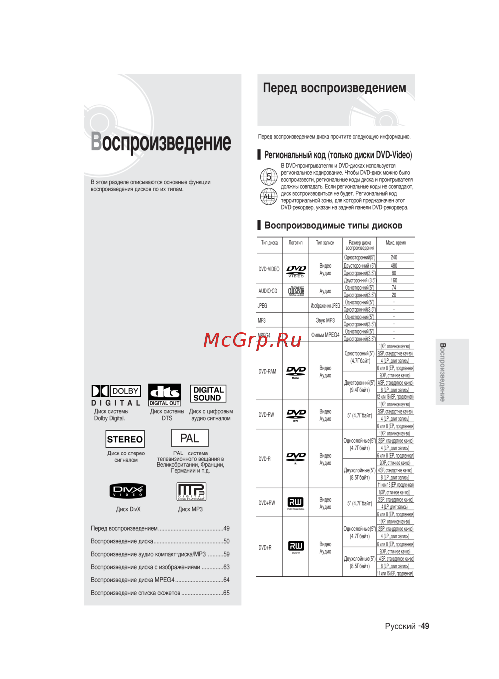 Перед воспроизведением Воспроизведение Перед воспроизведением диска прочтите следующую информацию Региональный код только диски DVD Video В DVD проигрывателях и DVD дисках используется региональное кодирование Чтобы DVD диск можно было воспроизвести региональные коды диска и проигрывателя В этом разделе описываются основные функции должны совпадать Если региональные коды не совпадают воспроизведения дисков по их типам диск воспроизводиться не будет Региональный код территориальной зоны для которой предназначен этот DVD рекордер указан на задней панели DVD рекордера I Воспроизводимые типы дисков Тип дека Itann DVD VIDEO VIDEO AUDIO CD 0 ltK Типажа Ряыердиоа Иж Еремя Сансстсрсн 5 240 Видео Двустсоонний 151 480 Аудио 0жданш 3 51 80 Двистсожхй 13 5 160 Аудио 0жтакнн 151 74 0жгиннит 3 5 1 20 0жт хин 151 Изображай JPEG 0жгахнтий 3 51 JPEG MP3 Звук МРЗ MPEG4 Фильм MPEG4 0жг хин 51 0жданм 3 51 Ожт инн 51 0ж1Ф и й13 51 ОдюаоринОД 4 7Гбайт Видео DVD RAM RAM mure гай 2 3 гадатега 4 1Р дпитзапсь1 ии 8 ЕР поздвга Аудио 2X шлите во Двусторонний 51 АбР станиптега тп DIGITAL SOUND DOLBY DIGITAL 9 4Гбайт 8ILP длит зала 2 ни 16 EP rpjjretcf тнтега1 Диск системы Dolby Digital Диск системы DTS Диск с цифровым аудио сигналом Видео DVD RW ИЛ Аудио 283падаптем 5 4 7Гбайт 4 1Р жзглкь1 6ии8 ЕР лтини STEREO murerai PAL Однослойные 5 3 3 стайте качки 4 7Гбайт Диск со стерео сигналом PAL система телевизионного вещания в Великобритании Франции Германии и т д Видео DVD R гпн Аудио аХР оглмтекагв Двухслойные fßP cBWnrerai 8 5Гбайт 8 1Р длитзапи 1 11 кгм 15IEP тоианя or we ilì DIGITAL loiscPLAYgAQS DVDtRW Диск DivX 4 LP длит зала ии 8 ЕР поздв1газ ЕШ OKV lUWIaOl Диск MP3 Видео Аудио ЗЗРсвдатега 5 4 7Гбайт 41Р дитииЫ 1ит8 ЕР птш 1нзя1 mw ra1 Перед воспроизведением 49 Однослойные 5 3S3 стайте качвэ 4 7Гбайт Воспроизведение диска 50 DVDtR Воспроизведение аудио компакт дискаМРЗ 59 ЕПЛ CKO й 4 1Р жзглкь1 6 ии 8 ЕР nogueral Видео Аудио ЗР отлнте кагкй Двухслойные 5 4 3 свете м Воспроизведение диска с изображениями 63 8 5Гбайт 8 1Р длитзапи 11ии 15 ЕР ВД1Г0 1 Воспроизведение диска МРЕО4 64 Воспроизведение списка сюжетов 65 Русский 49