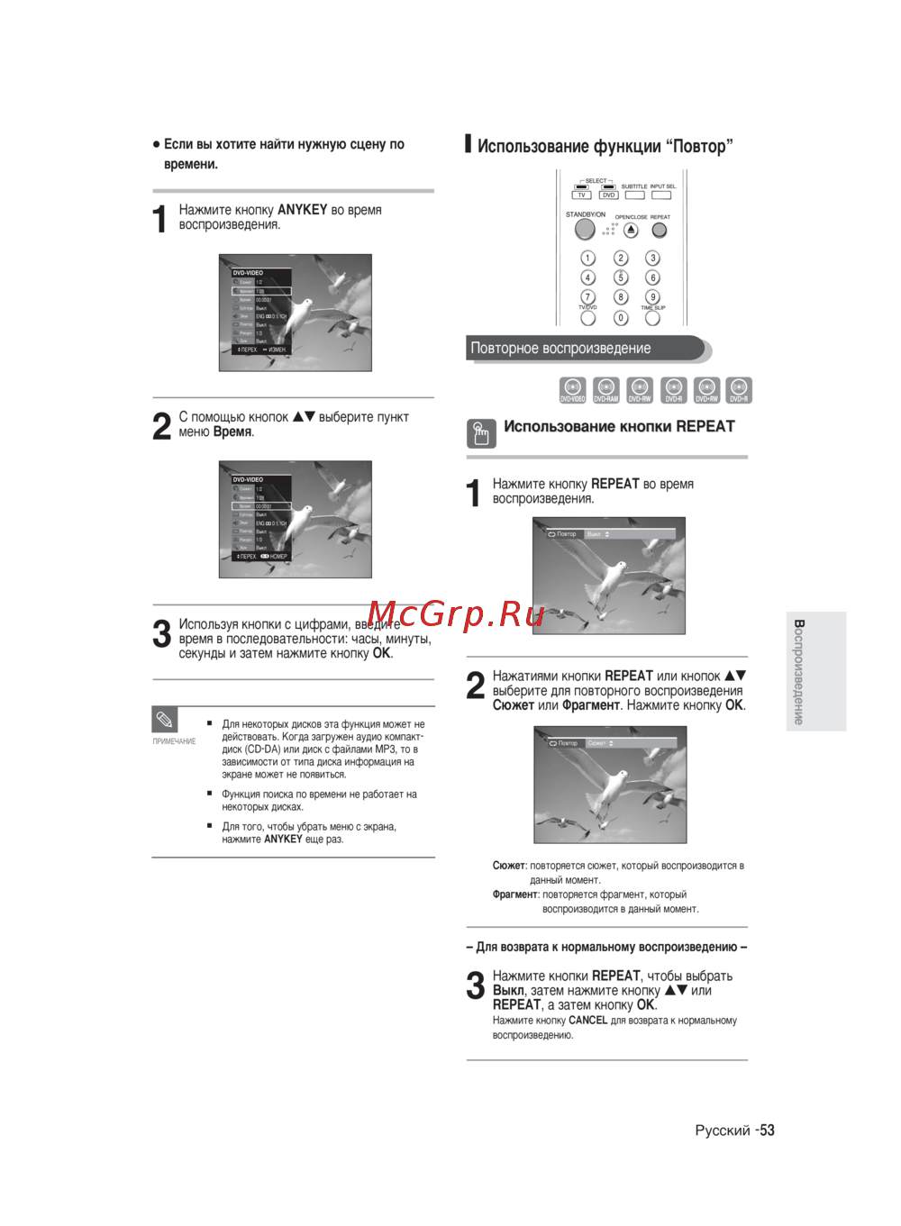 Если вы хотите найти нужную сцену по I Использование функции Повтор времени 1 Нажмите кнопку ANYKEY во время воспроизведения Повторное воспроизведение кл кл ЙЕЗ 1м Я iMifl 1 1 2 С помощью кнопок AV выберите пункт меню Время Использование кнопки REPEAT 1 Нажмите кнопку REPEAT во время воспроизведения Используя кнопки с цифрами введите время в последовательности часы минуты секунды и затем нажмите кнопку ОК 2 Нажатиями кнопки REPEAT или кнопок АТ выберите для повторного воспроизведения Сюжет или Фрагмент Нажмите кнопку ОК Для некоторых дисков эта функция может не действовать Когда загружен аудио компактдиск CD DA или диск с файлами MP3 то в зависимости от типа диска информация на экране может не появиться Функция поиска по времени не работает на некоторых дисках Для того чтобы убрать меню с экрана нажмите ANYKEY еще раз Сюжет повторяется сюжет который воспроизводится в данный момент Фрагмент повторяется фрагмент который воспроизводится в данный момент Для возврата к нормальному воспроизведению 3 Нажмите кнопки REPEAT чтобы выбрать Выкл затем нажмите кнопку АТ или REPEAT а затем кнопку ОК Нажмите кнопку CANCEL для возврата к нормальному воспроизведению Русский 53 Воспроизведение 3 ЕЙЛ