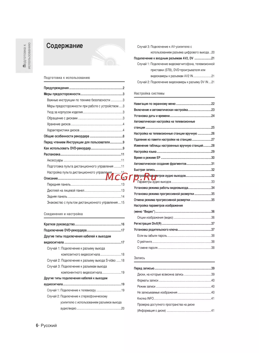 Содержание Случай 3 Подключение к AV усилителю с использованием разъема цифрового выхода 20 Подключение к входным разъемам AV2 DV 21 Случай 1 Подключение приставки STB видеомагнитофона телевизионной DVD проигрывателя или видеокамеры к разъемам AV2IN 21 Подготовка к использованию Случай 2 Подключение видеокамеры к разъему DV IN 21 Предупреждения 2 Меры предосторожности 3 Настройка системы Важные инструкции по технике безопасности 3 Навигация по экранному меню 22 Меры предосторожности при работе с устройством 3 Включение и автоматическая настройка 23 Уход за корпусом изделия 3 Установка даты и времени 24 Обращение с дисками 3 Автоматическая настройка на телевизионные Хранение дисков 4 станции______ __________________________________________________ 25 Характеристики дисков 4 Настройка на телевизионные станции вручную 26 Общие особенности рекордера 8 Удаление из памяти настройки на станцию 27 Перед чтением Инструкции для пользователя 9 Изменение таблицы настроенных вручную станций 28 Как использовать ОУО рекордер 9 Настройка языка 29 Распаковка 11 Время в режиме ЕР 30 Аксессуары 11 Автоматическое создание фрагментов 31 Подготовка пульта дистанционного управления 11 Быстрая запись 32 Настройка пульта дистанционного управления 11 Настройка параметров аудио выходов 32 Описание 13 Параметры аудио выходов 33 Передняя панель 13 Установка режима работы видеовыхода 34 Дисплей на лицевой панел 13 Установка режима прогрессивной развертки 35 Задняя панель 14 Отмена режима прогрессивной развертки 35 Знакомство с пультом дистанционного управления 15 Настройка параметров изображения меню Видео 36 Соединения и настройка Опции изображения видео 36 Краткое руководство 16 Регистрация DivX R ______________________________________________ 37 Подключение ОУО рекордера 17 Установка родительского ключа 37 Другие типы подключения кабелей к выходам Если вы забыли пароль 38 видеосигнала___________________________________________________17 О рейтинге 38 О смене пароля 38 Случай 1 Подключение к разъему выхода композитного видеосигнала 18 Запись Случай 2 Подключение к разъему выхода Зллбео 18 Случай 3 Подключение к разъемам выхода компонентного видеосигнала 19 Перед записью 39 Диски на которые возможна запись 39 Другие типы подключения кабелей к выходам Форматы записи 40 аудиосигнала 19 Режим записи 40 Случай 1 Подключение к телевизору 19 Не записываемые изображения 40 Случай 2 Подключение к стереофоническому Кнопка INFO 41 усилителю с использованием разъемов выхода Проверка доступного пространства на диске аудиовидео 20 Информация о диске 41 6 Русский