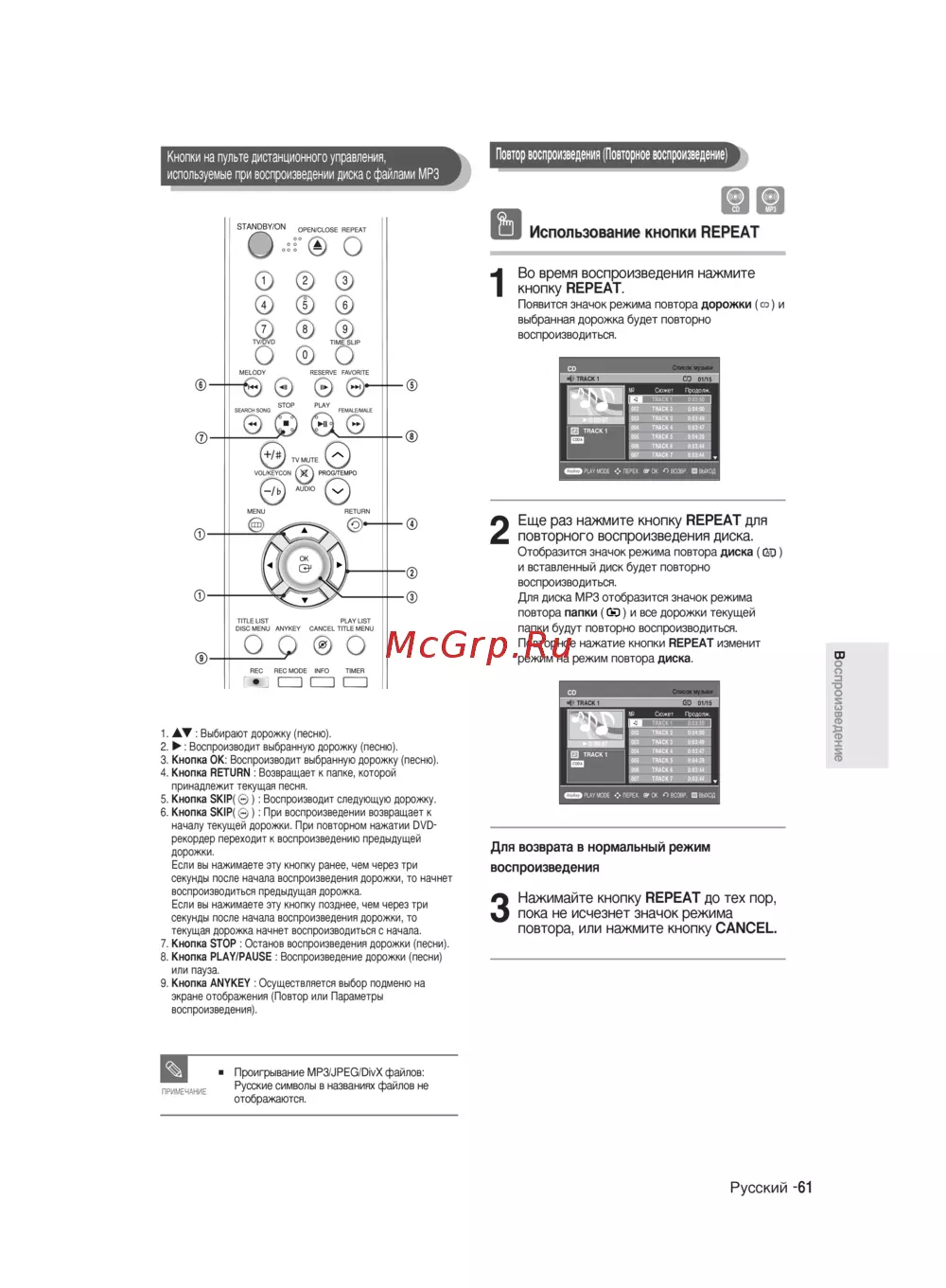 Кнопки на пульте дистанционного управления Повтор воспроизведения Повторное воспроизведение используемые при воспроизведении диска с файлами МРЗ Sй Использование кнопки REPEAT Во время воспроизведения нажмите кнопку REPEAT Появится значок режима повтора дорожки со и выбранная дорожка будет повторно воспроизводиться 2 Еще раз нажмите кнопку REPEAT для повторного воспроизведения диска Отобразится значок режима повтора диска СО и вставленный диск будет повторно воспроизводиться Для диска МРЗ отобразится значок режима повтора папки О и все дорожки текущей папки будут повторно воспроизводиться Повторное нажатие кнопки REPEAT изменит Воспроизведение режим на режим повтора диска 1 АТ Выбирают дорожку песню 2 Воспроизводит выбранную дорожку песню 3 Кнопка ОК Воспроизводит вьбранную дорожку песню 4 Кнопка RETURN Возвращает к папке которой принадлежит текущая песня 5 Кнопка SKIP Q Воспроизводит следующую дорожку 6 Кнопка SKIP При воспроизведении возвращает к началу текущей дорожки При повторном нажатии DVDрекордер переходит к воспроизведению предыдущей дорожки Для возврата в нормальный режим Если вы нажимаете эту кнопку ранее чем через три воспроизведения секунды после начала воспроизведения дорожки то начнет воспроизводиться предыдущая дорожка Если вы нажимаете эту кнопку позднее чем через три секунды после начала воспроизведения дорожки то текущая дорожка начнет воспроизводиться с начала 3 Нажимайте кнопку REPEAT до тех пор пока не исчезнет значок режима повтора или нажмите кнопку CANCEL 7 Кнопка STOP Останов воспроизведения дорожки песни 8 Кнопка PLAY PAUSE Воспроизведение дорожки песни или пауза 9 Кнопка ANYKEY Осуществляется выбор подменю на экране отображения Повтор или Параметры воспроизведения Проигрывание МРЗ ЛРЕ ОмХ файлов ПРИМЕ ЧАШЕ Русские символы в названиях файлов не отображаются Русский 61