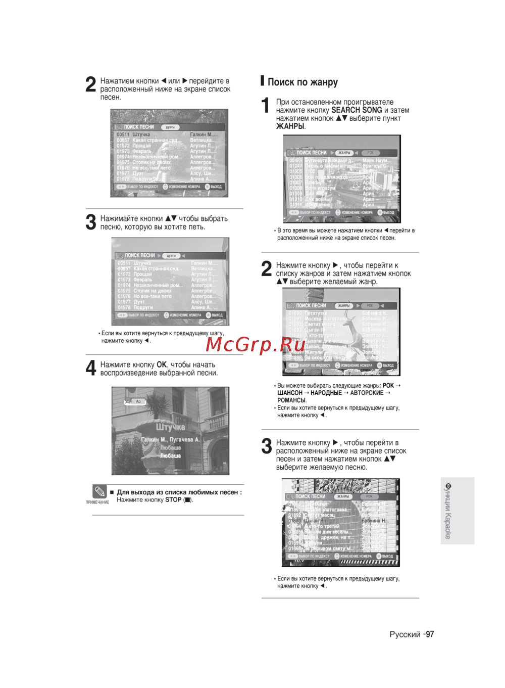 2 Нажатием кнопки или перейдите в расположенный ниже на экране список песен I Поиск по жанру При остановленном проигрывателе нажмите кнопку SEARCH SONG и затем нажатием кнопок АТ выберите пункт ЖАНРЫ 1 3 Нажимайте кнопки АТ чтобы выбрать песню которую вы хотите петь В это время вы можете нажатием кнопки перейти в расположенный ниже на экране список песен 2 Нажмите кнопку чтобы перейти к списку жанров и затем нажатием кнопок АТ выберите желаемый жанр Если вы хотите вернуться к предьщущему шагу нажмите кнопку Ч 4 Нажмите кнопку ОК чтобы начать воспроизведение выбранной песни Вы можете выбирать следующие жанры РОК ШАНСОН НАРОДНЫЕ АВТОРСКИЕ РОМАНСЫ Если вы хотите вернуться к предыдущему шагу нажмите кнопку Ч 3 ЕР ПРИМЕЧАНИЕ Нажмите кнопку чтобы перейти в расположенный ниже на экране список песен и затем нажатием кнопок АТ выберите желаемую песню Для выхода из списка любимых песен Нажмите кнопку STOP Если вы хотите вернуться к предыдущему шагу нажмите кнопку Ч Русский 97