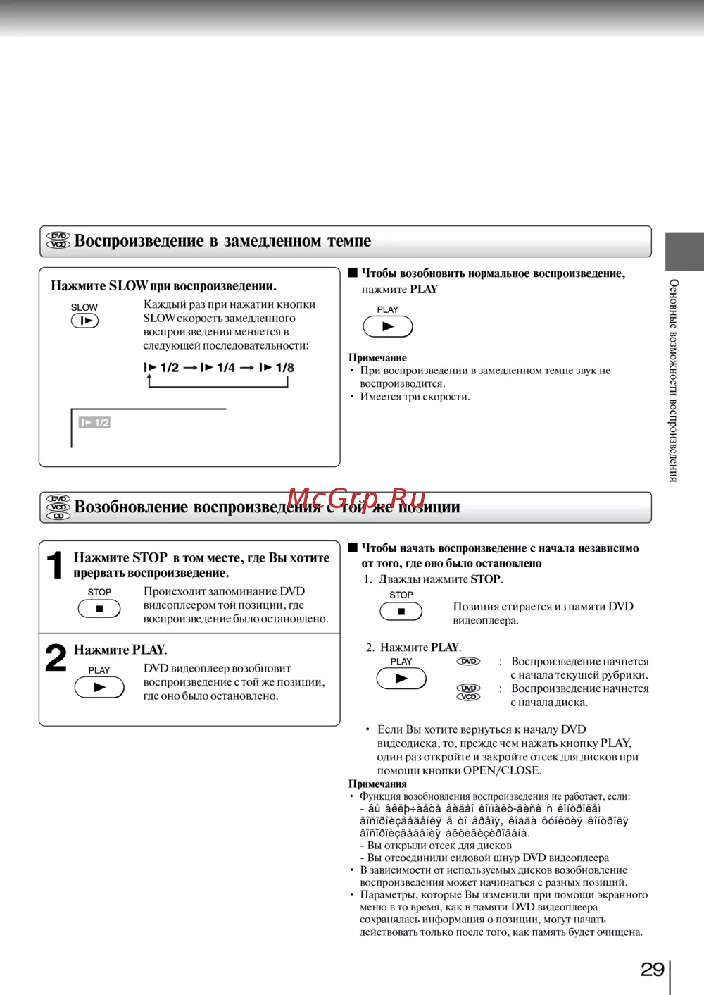SB Воспроизведение в замедленном темпе SLOW I Каждый раз при нажатии кнопки SLOW скорость замедленного воспроизведения меняется в следующей последовательности Основные возможности воспроизведения Чтобы возобновить нормальное воспроизведение Нажмите SLOW при воспроизведении нажмите PLAY PLAY Примечание 1 2 1 4 1 8 t_______________________I При воспроизведении в замедленном темпе звук не воспроизводится Имеется три скорости Возобновление воспроизведения с той же позиции 1 Нажмите STOP в том месте где Вы хотите прервать воспроизведение STOP Лв 2 Происходит запоминание DVD видеоплеером той позиции где воспроизведение было остановлено Нажмите PLAY DVD видеоплеер возобновит воспроизведение с той же позиции где оно было остановлено PLAY Чтобы начать воспроизведение с начала независимо от того где оно было остановлено 1 Дважды нажмите STOP STOP А Позиция стирается из памяти DVD видеоплеера 2 Нажмите PLAY PLAY CPV Воспроизведение начнется с начала текущей рубрики Воспроизведение начнется с начала диска Если Вы хотите вернуться к началу DVD видеодиска то прежде чем нажать кнопку PLAY один раз откройте и закройте отсек для дисков при помощи кнопки OPEN CLOSE Примечания Функция возобновления воспроизведения не работает если ай аёёр ааоа аёаа ёнТаёо аёпё п ёндд1ёа ainidie aAaAiey a di adaiy ё ааа д6 ёбёу ёПдд ёу а1П1 д ё9аёаё ёу аёдёаё9ёд1аа а Вы открыли отсек для дисков Вы отсоединили силовой шнур DVD видеоплеера В зависимости от используемых дисков возобновление воспроизведения может начинаться с разных позиций Параметры которые Вы изменили при помощи экранного меню в то время как в памяти DVD видеоплеера сохранялась информация о позиции могут начать действовать только после того как память будет очищена 29