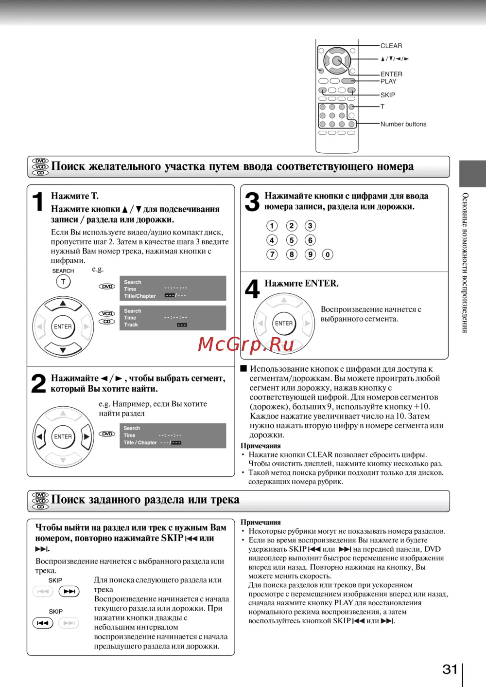 Поиск желательного участка путем ввода соответствующего номера Основные возможности воспроизведения Нажмите Т Нажмите кнопки А для подсвечивания записи раздела или дорожки Если Вы используете видео аудио компакт диск пропустите шаг 2 Затем в качестве шага 3 введите нужный Вам номертрека нажимая кнопки с цифрами SEARCH e g 2 Нажимайте 4 чтобы выбрать сегмент который Вы хотите найти e g Например если Вы хотите найти раздел Использование кнопок с цифрами для доступа к сегментам дорожкам Вы можете проиграть л юбой сегмент или дорожку нажав кнопку с соответствующей цифрой Для номеров сегментов дорожек больших 9 используйте кнопку 10 Каждое нажатие увеличиваетчисло на 10 Затем нужно нажать вторую цифру в номере сегмента или дорожки Примечания Нажатие кнопки CLEAR позволяет сбросить цифры Чтобы очистить дисплей нажмите кнопку несколько раз Т акой метол поиска рубрики пол хол in только для дисков содержащих номера рубрик Поиск заданного раздела или трека Чтобы выйти на раздел или трек с нужным Вам номером повторно нажимайте SKIP или м Восп рои зведение начнется с выбранного раздела ил и трека SKIP Для поиска следующего раздела или трека Воспроизведение начинается с начала текущего раздела или дорожки При SKIP нажатой кнопки дважды с небольшим интервалом воспроизведение начинается с начала предыдущего раздела или дорожки Примечания Некоторые рубрики могут не показывать номера разделов Если во время воспроизведения Вы нажмете и будете удерживать SKIP 144 или на передней панели DVD видеоплеер выполнит быстрое перемещение изображения вперед или назад Повторно нажимая на кнопку Вы можете менять скорость Для поиска разделов или треков при ускоренном просмотре с перемещением изображения вперед или назад сначала нажмите кнопку PLAY для восстановления нормального режима воспроизведения а затем воспользуйтесь кнопкой SKIP 144 или 31