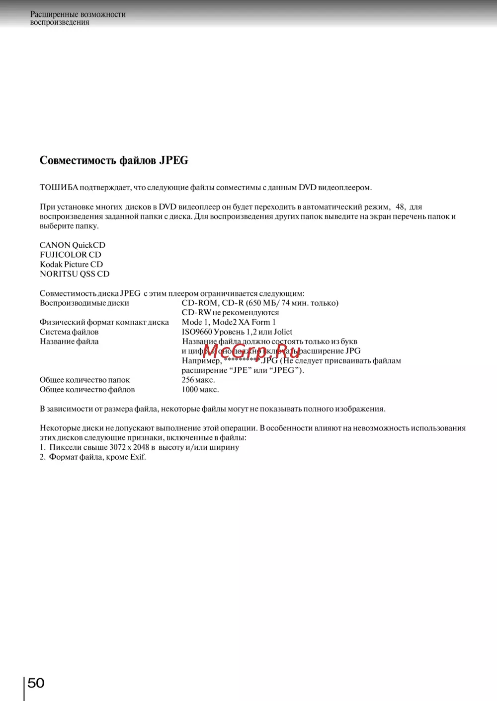Расширенные возможности воспрои звед ения Совместимость файлов JPEG ТОШИБА подтверждает что следующие файлы совместимы с данным DVD видеоплеером При установке многих дисков в DVD видеоплеер он будет переходить в автоматический режим 48 для воспроизведения заданной папки с диска Для воспроизведения других папок выведите на экран перечень папок и выберите папку CANON QuickCD FUJICOLORCD Kodak Picture CD NORITSU QSS CD Совместимость диска JPEG с этим плеером ограничивается следующим Воспроизводимые диски CD ROM CD R 650MB 74мин только СD RW не рекомендуются Физический формат компакт диска Mode 1 Mode2 ХА Form 1 Система файлов ISO9660 Уровень 1 2 ил и Joliet Название файла Название файла должно состоять только из букв и цифр и оно должно вкл ючать расширение JPG Например JPG Не следует присваивать файлам расширение JPE или JPEG Общее количество папок 256макс Общее количество файл ов 1000 макс В зависимости от размера файла некоторые файлы могут не показывать полного изображения Некоторые диски не допускают выполнение этой операции В особенности влияютна невозможностьиспользования этих дисков следующие признаки включенные в файлы 1 Пиксели свыше 3072 х 2048 в высоту и или ширину 2 Формат файла кроме Exif 50