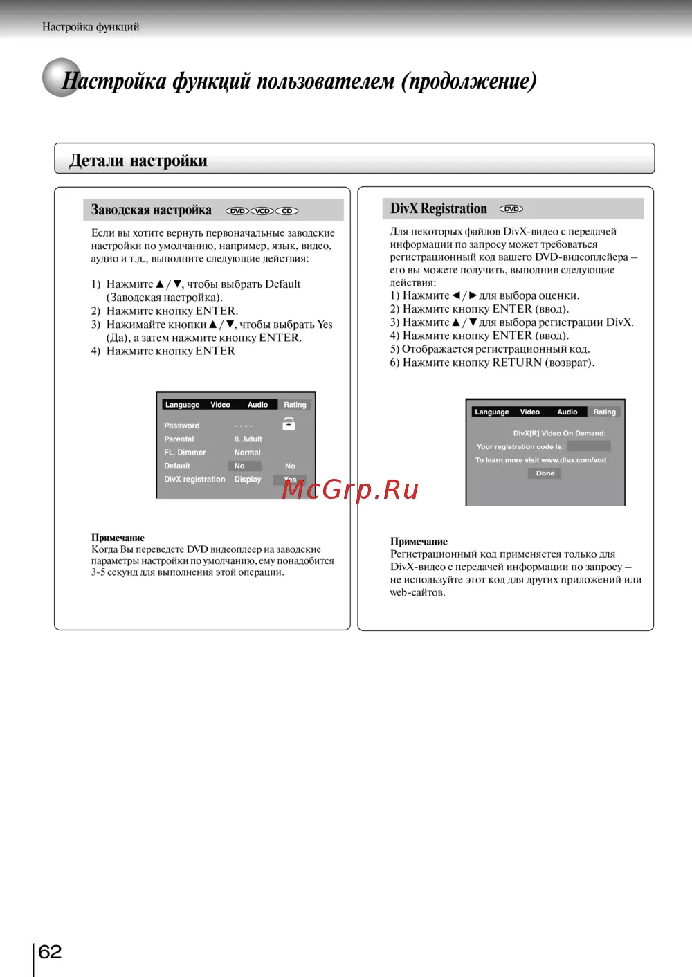 Настройка функций Настройка функций пользователем продолжение Детали настройки Заводская настройка DivX Registration Если вы хотите вернуть первоначальные заводские настройки по умолчанию например язык видео аудио и т д выполните следующие действия Для некоторых файлов DivX видео с передачей информации по запросу может требоваться регистрационный код вашего DVD видеоплейера его вы можете получить выполнив следующие действия 1 Нажмите длявыбора оценки 2 Нажмите кнопку ENTER ввод 3 Нажмите А для выбора регистрации DivX 4 Нажмите кнопку ENTER ввод 5 Отображается регистрационный код 6 Нажмите кнопку RETURN возврат 1 Нажмите А чтобы выбрать Default Заводская настройка 2 Нажмите кнопку ENTER 3 Нажимайте кнопки А чтобы выбрать Yes Да а затем нажмите кнопку ENTER 4 Нажмите кнопку ENTER Language Video Audio Rating Language Video Audio Rating Password a Parental 8 Adult DivX R Video On Demand Your registration code Is FL Dimmer Normal Default No No DivX registration Display Yes To learn more visit www divx com vod Done Примечание Когда Вы переведете DVD видеоплеер па заводские параметры настройки по умолчанию ему понадобится 3 5 секунд для выполнения этой операции 62 Примечание Регистрационный код применяется только для DivX видео с передачей информации по запросу не используйте этот код для других приложений или web сайтов