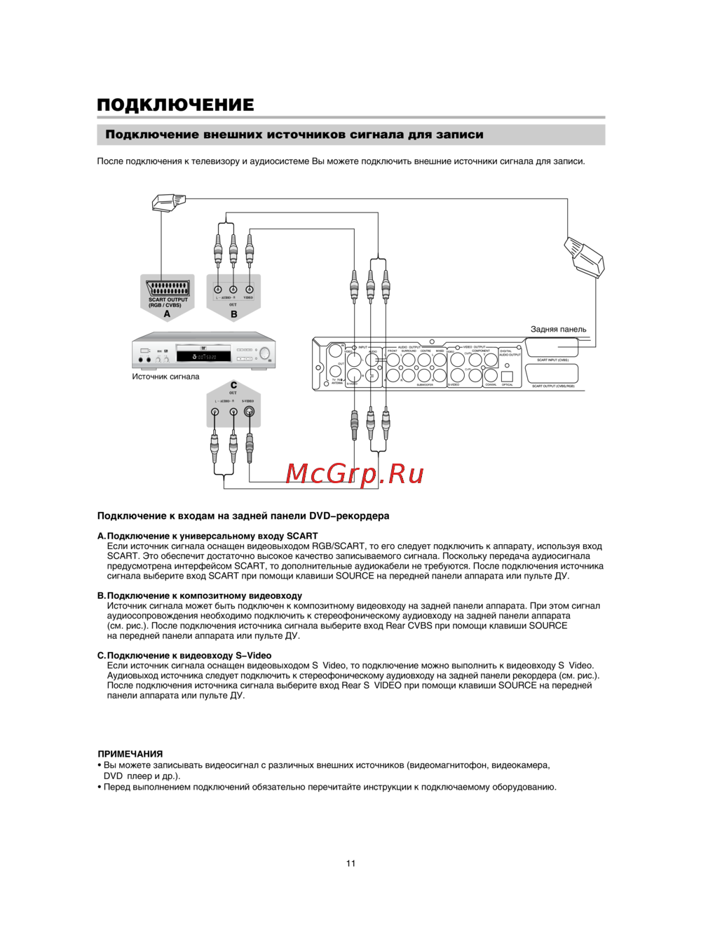 Если источник сигнала оснащен видеовыходом RGB/SCART, то его следует подключить к аппарату, используя вход