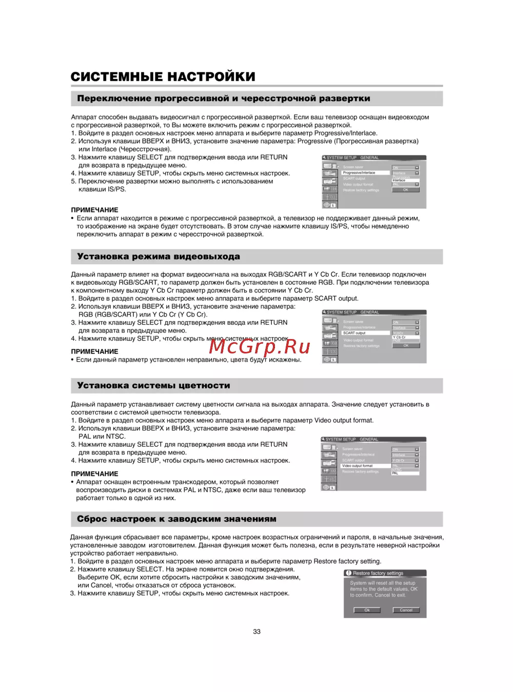 - Переключение прогрессивной и чересстрочной развертки p.36