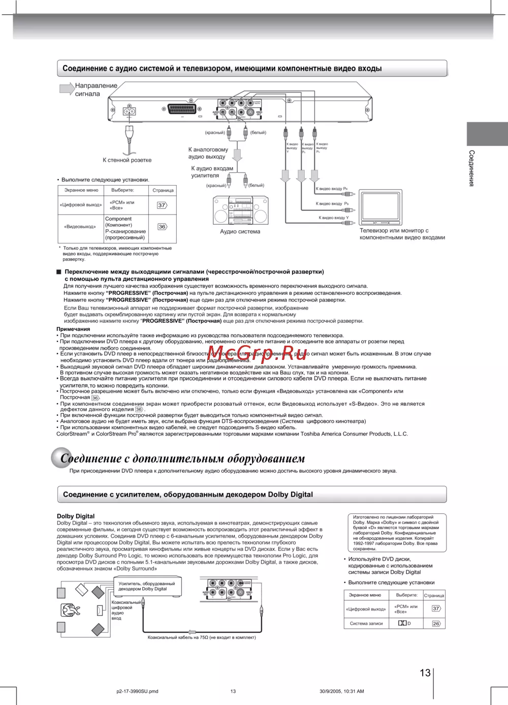 Соединение с аудио системой и телевизором имеющими компонентные видео входы белый красный К видео входу К аналоговому аудио выходу К стенной розетке К аудио входам усилителя Выполните следующие установки красный Экранное меню Выберите Цифровой выход РСМ ИЛИ Все белый Страница видео входу Ре К видео входу Y Component Видеовыход мдео входу РА сЦПП3 Компонент Р сканирование п рогрессивный Телевизор или монитор с компонентными видео входами Аудио система Только для телевизоров имеющих компонентные видео входы поддерживающие построчную развертку Переключение между выходящими сигналами чересстрочной построчной развертки с помощью пульта дистанционного управления Для получения лучшего качества изображения существует возможность временного переключения выходного сигнала Нажмите кнопку PROGRESSIVE Построчная на пульте дистанционного управления в режиме остановленного воспроизведения Нажмите кнопку PROGRESSIVE Построчная еще один раз для отключения режима построчной развертки Если Ваш телевизионный аппарат не поддерживает формат построчной развертки изображение будет выдавать скремблированную картинку или пустой экран Для возврата к нормальному изображению нажмите кнопку PROGRESSIVE Построчная еще раз для отключения режима построчной развертки Примечания При подключении используйте также информацию из руководства пользователя подсоединяемого телевизора При подключении DVD плеера к другому оборудованию непременно отключите питание и отсоедините все аппараты от розетки перед произведением любого соединения Если установить DVD плеер в непосредственной близости от тюнера или радиоприемника радио сигнал может быть искаженным В этом случае необходимо установить DVD плеер вдали от тюнера или радиоприемника Выходящий звуковой сигнал DVD плеера обладает широким динамическим диапазоном Устанавливайте умеренную громкость приемника В противном случае высокая громкость может оказать негативное воздействие как на Ваш слух так и на колонки Всегда выключайте питание усилителя при присоединении и отсоединении силового кабеля DVD плеера Если не выключать питание усилителя то можно повредить колонки Построчное разрешение может быть включено или отключено только если функция Видеовыход установлена как Component или Построчная зб При компонентном соединении экран может приобрести розоватый оттенок если Видеовыход использует S Видео Это не является дефектом данного изделия эё При включенной функции построчной развертки будет выводиться только компонентный видео сигнал Аналоговое аудио не будет иметь звук если выбрана функция DTS воспроизведения Система цифрового кинотеатра При использовании компонентных видео кабелей не следует подсоединять S видео кабель CdorStream и ColorStream Pro являются зарегистрированными торговыми марками компании Toshiba America Consumer Products L L C Соединение с дополнительным оборудованием При присоединении DVD плеера к дополнительному аудио оборудованию можно достичь высокого уровня динамического звука Соединение с усилителем оборудованным декодером Dolby Digital Dolby Digital Dolby Digital это технология объемного звука используемая в кинотеатрах демонстрирующих самые современные фильмы и сегодня существует возможность воспроизводить этот реалистичный эффект в домашних условиях Соединив DVD плеер с 6 канальным усилителем оборудованны