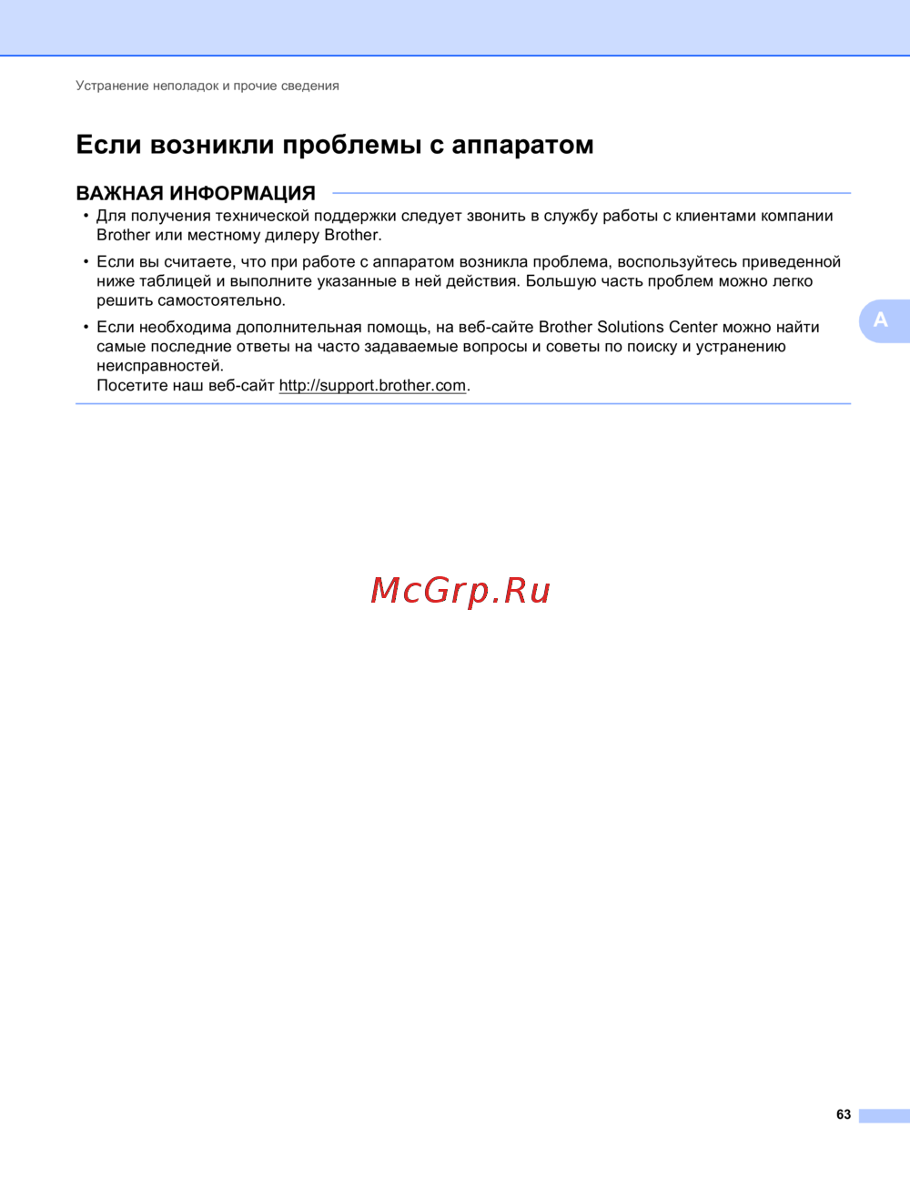 - Если необходима дополнительная помощь на веб сайте brother solutions center можно найти самые последние ответы на часто задаваемые вопросы и советы по поиску и устранению неисправностей посетите веб сайт http support brother com p.62