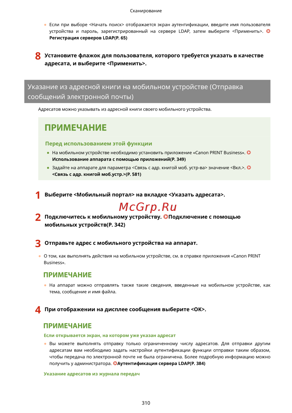 аппарат можно отправлять также такие сведения, введенные на мобильном устройстве, как