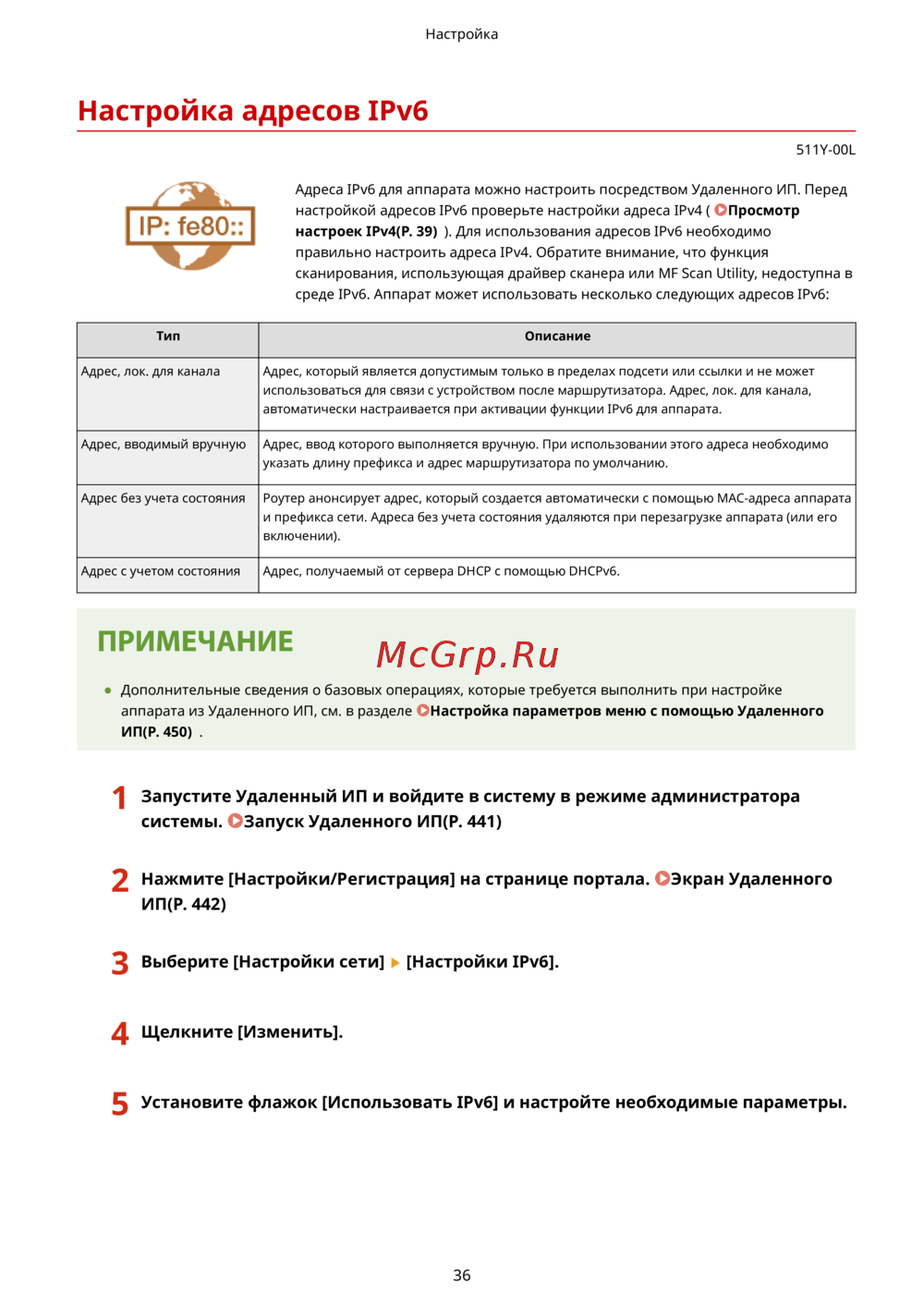 Адреса IPv6 для аппарата можно настроить посредством Удаленного ИП. Перед