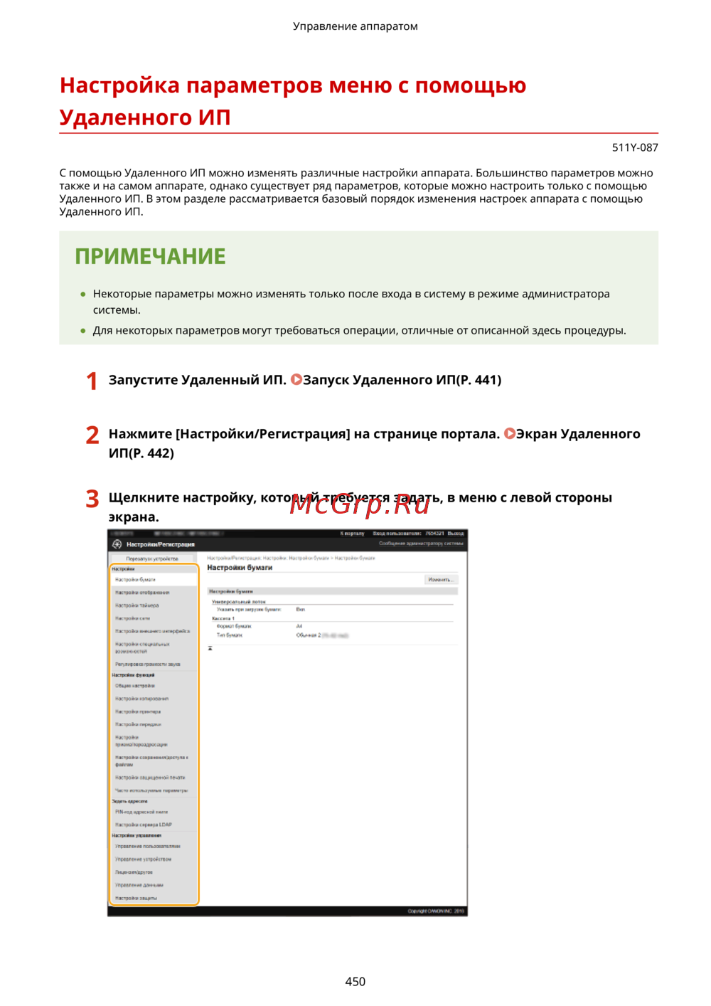 Удаленного ИП. В этом разделе рассматривается базовый порядок изменения настроек аппарата с помощью