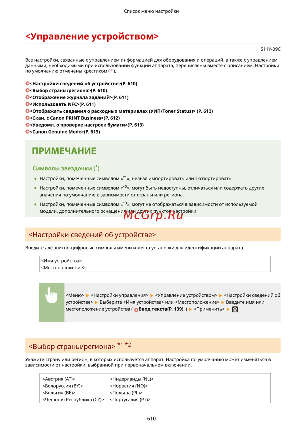 <Выбор страны/региона>(P. 610)