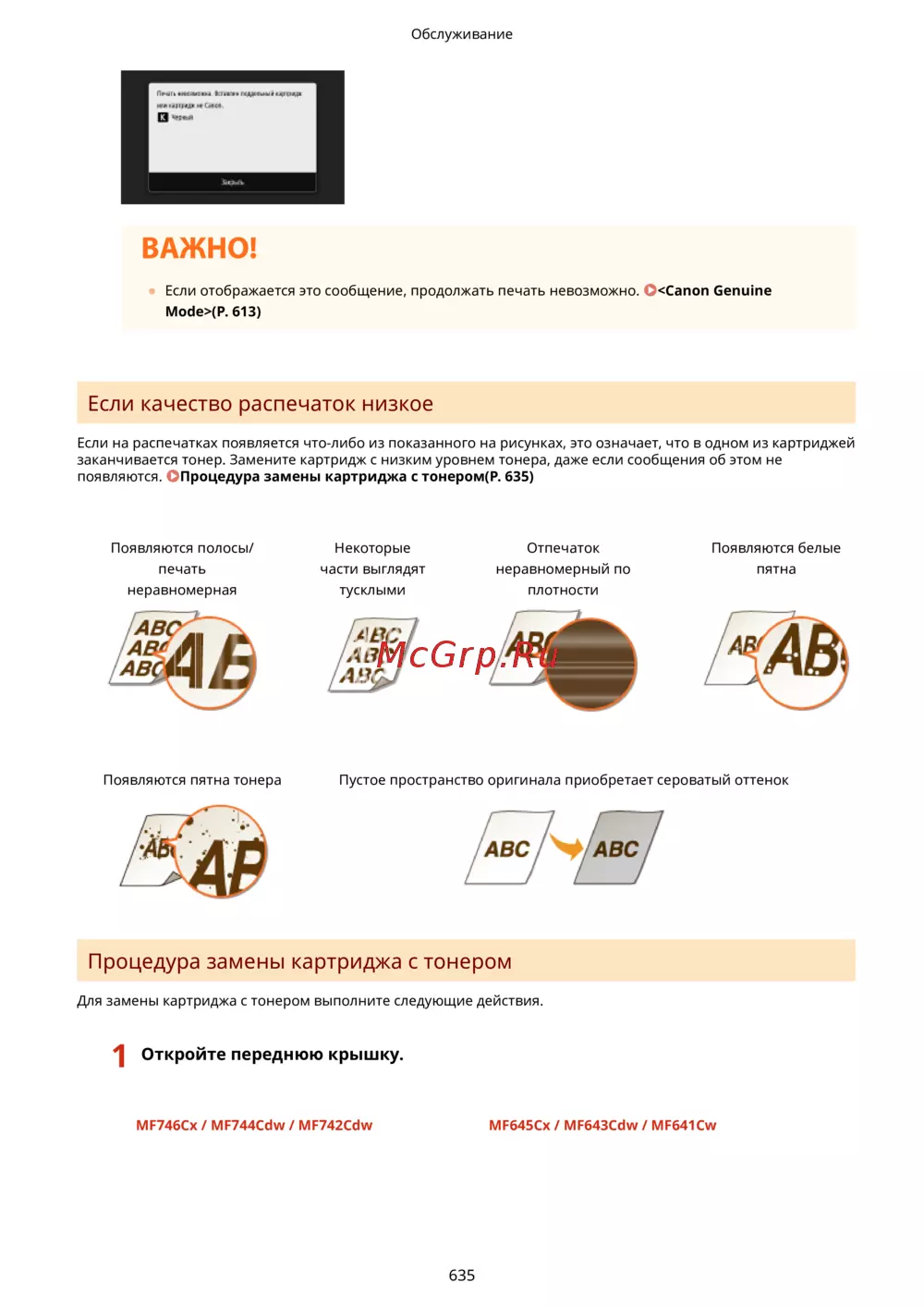 заканчивается тонер. Замените картридж с низким уровнем тонера, даже если сообщения об этом не