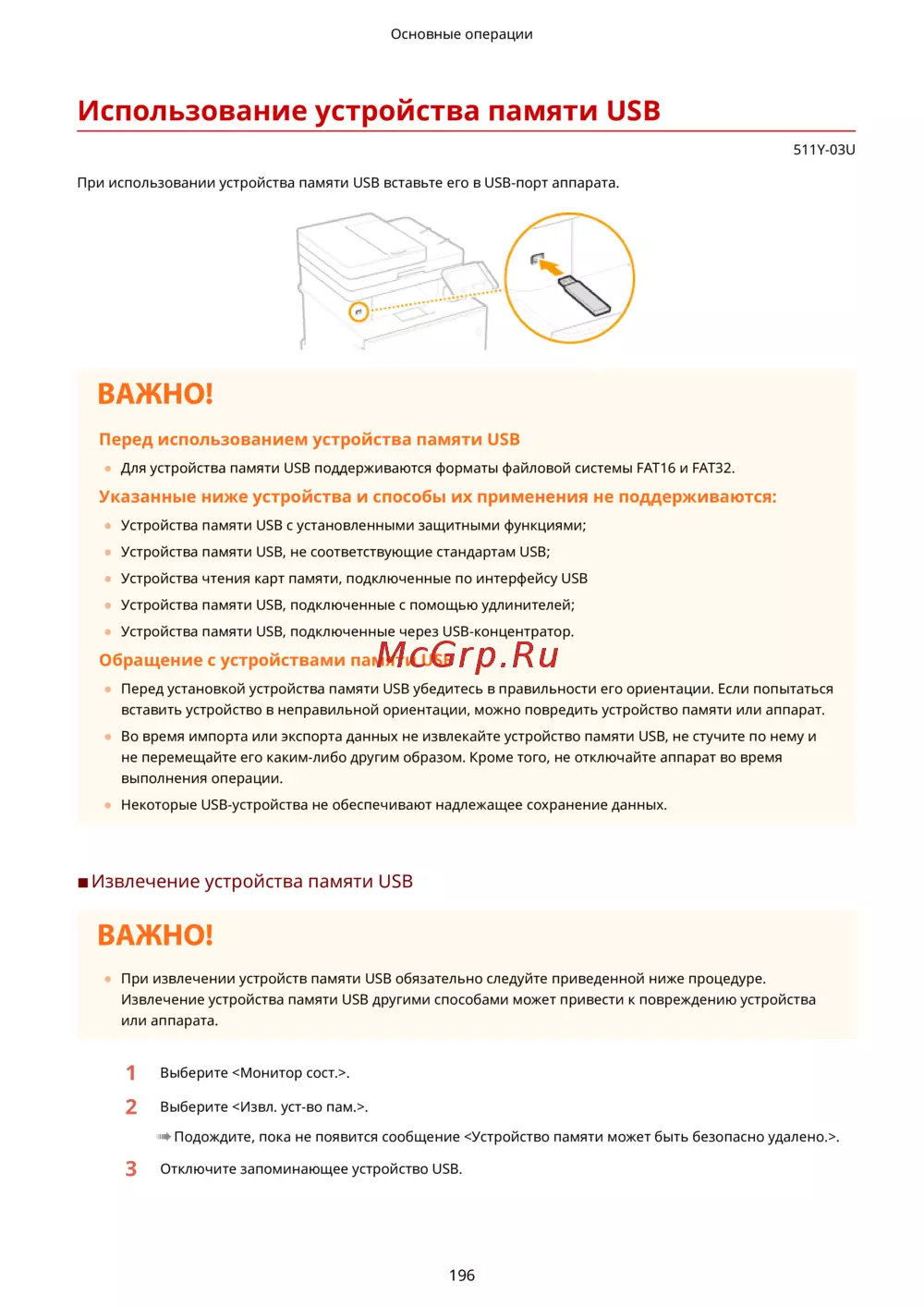 Извлечение устройства памяти USB другими способами может привести к повреждению устройства