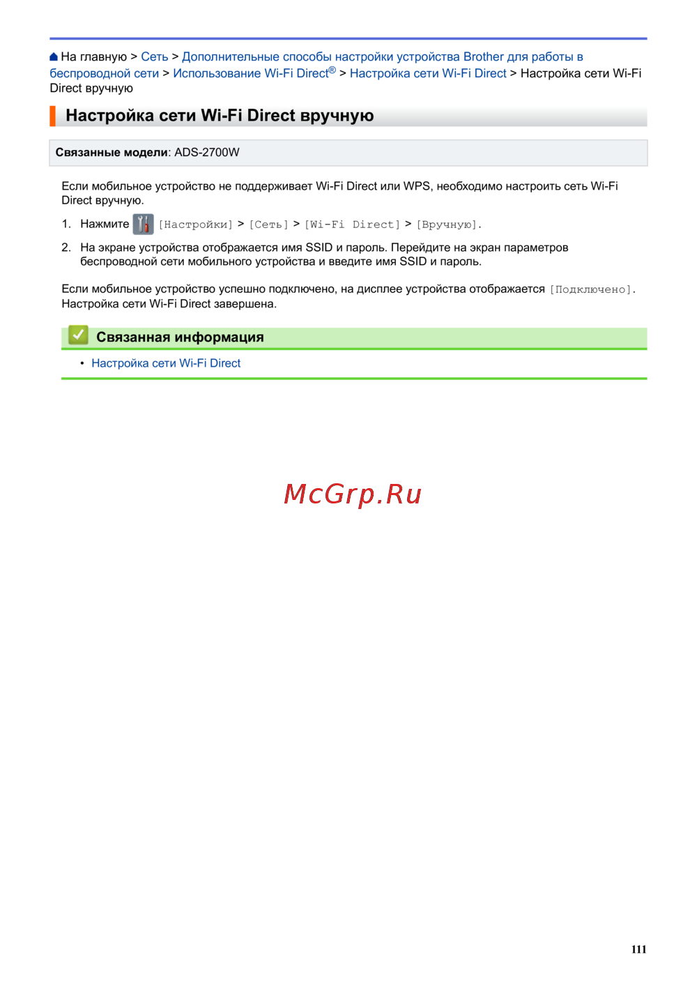Если мобильное устройство не поддерживает Wi-Fi Direct или WPS, необходимо настроить сеть Wi-Fi
