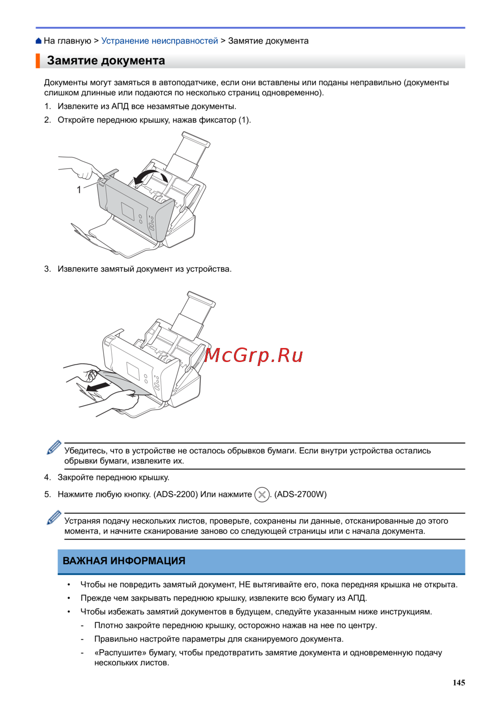 Brother ADS-2200 (ADS2200TC1) — как устранить замятие документа в автоподатчике [149/215]