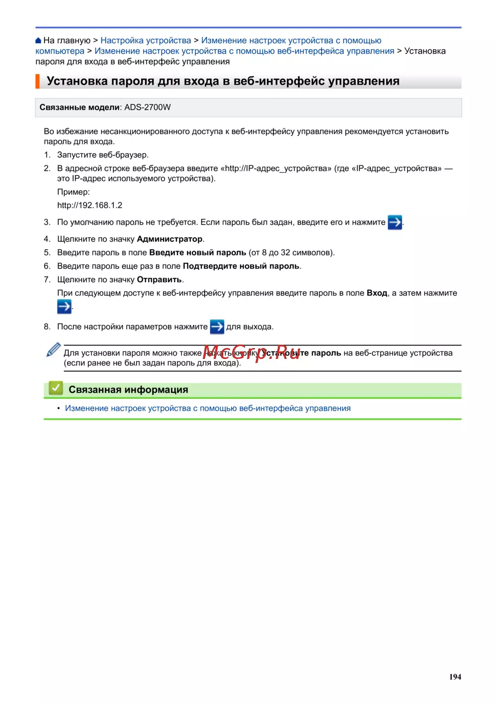 Brother ADS-2200 (ADS2200TC1) — как установить пароль для веб-интерфейса управления устройством [198/215]
