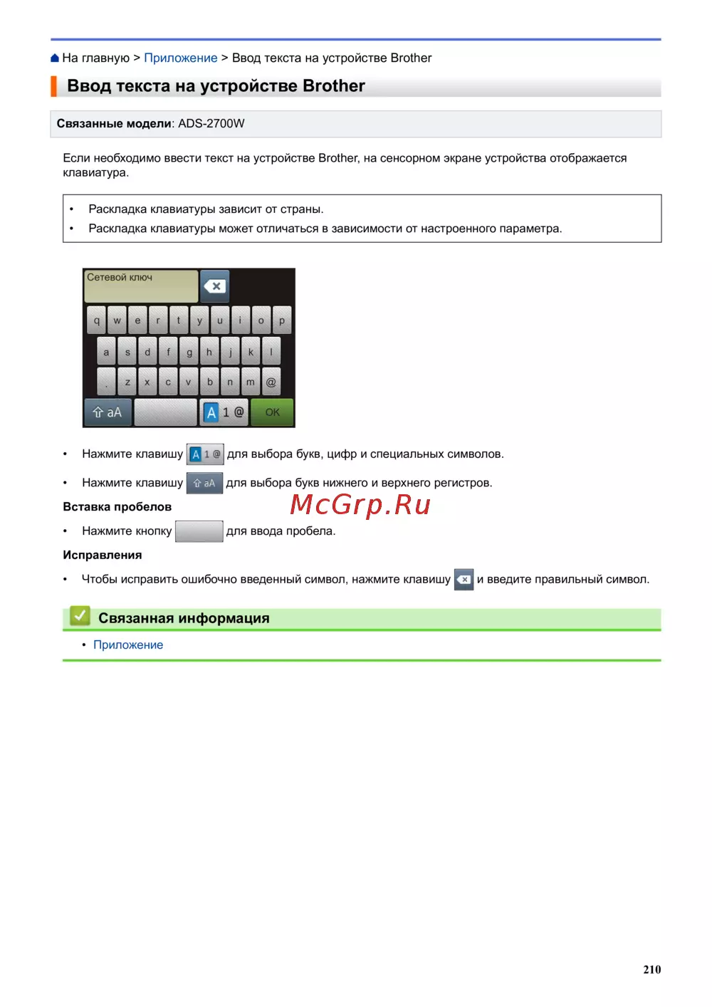Brother ADS-2200 (ADS2200TC1) — как вводить текст на устройствах с сенсорным экраном [214/215]