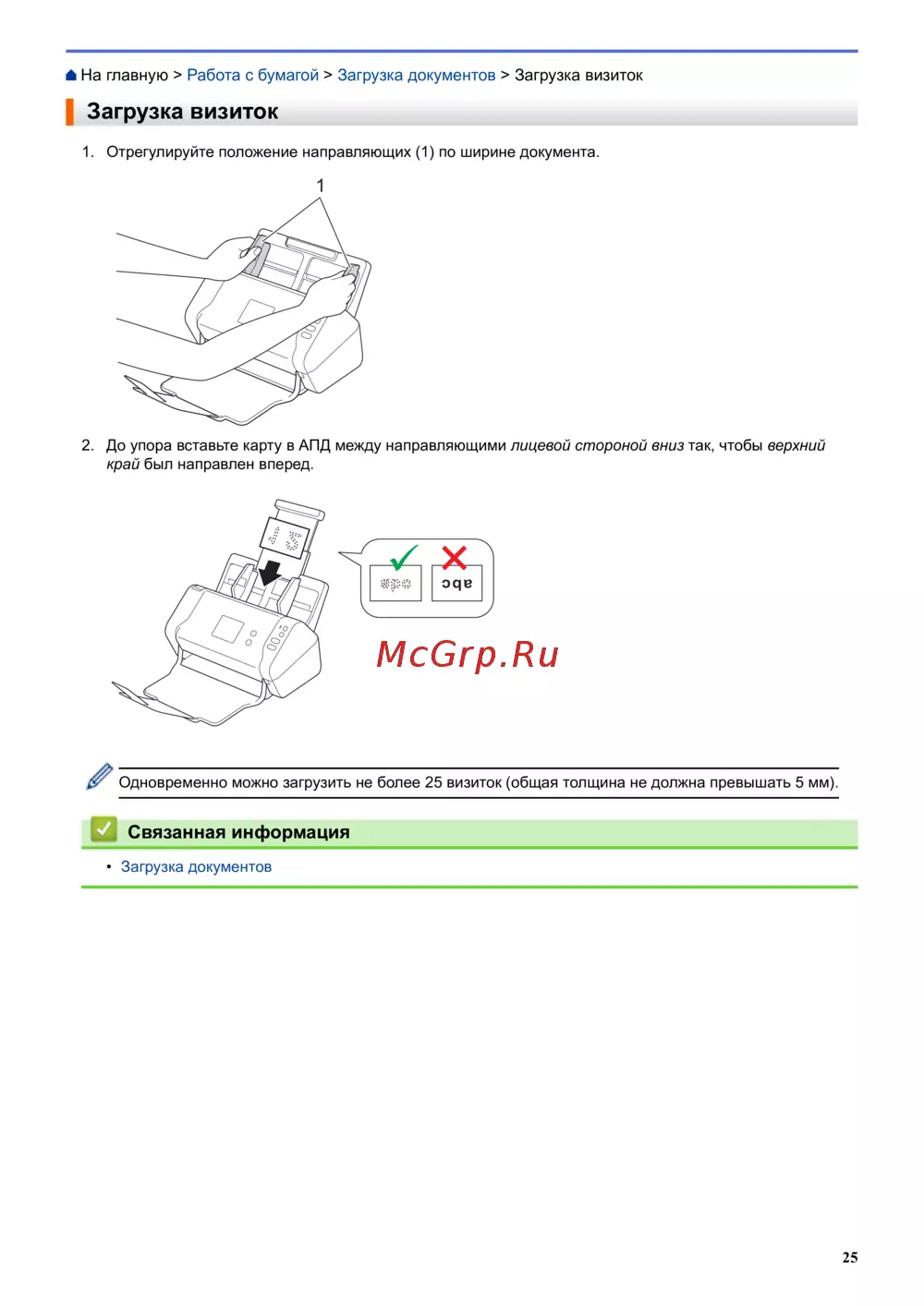 Одновременно можно загрузить не более 25 визиток (общая толщина не должна превышать 5 мм).