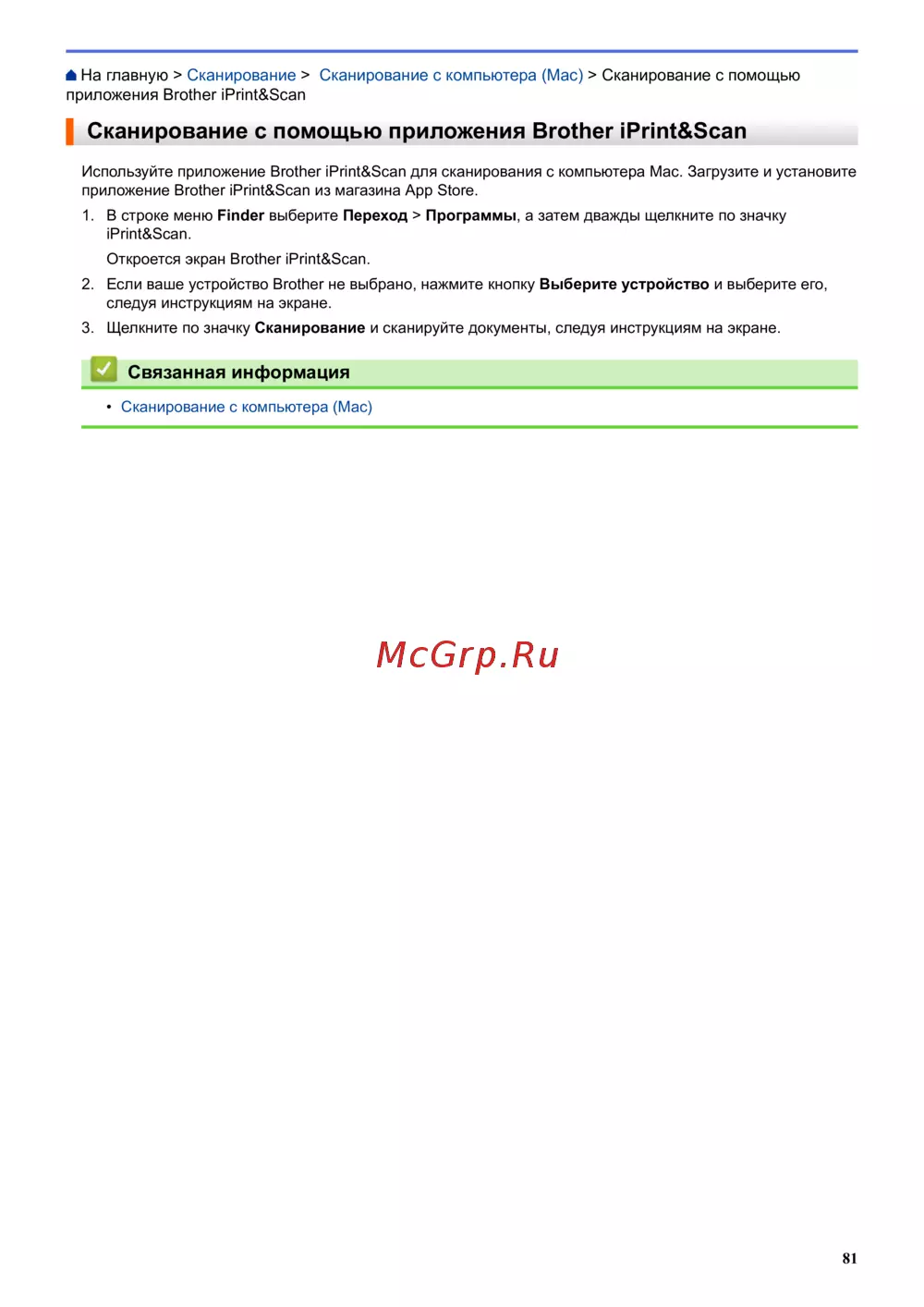 Используйте приложение Brother iPrint&Scan для сканирования с компьютера Mac. Загрузите и установите