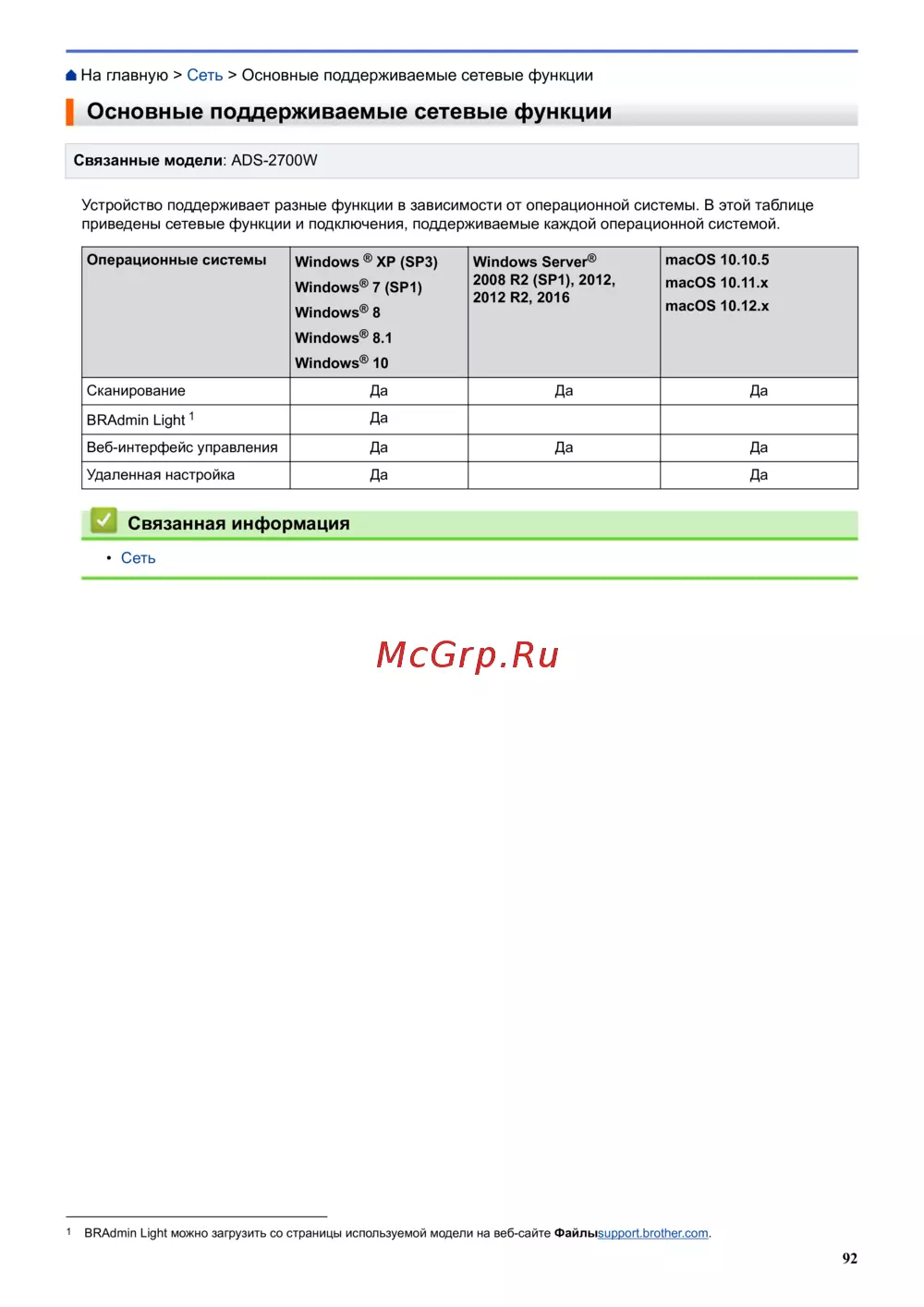 Brother ADS-2200 (ADS2200TC1) — основные сетевые функции и поддерживаемые операционные системы [96/215]