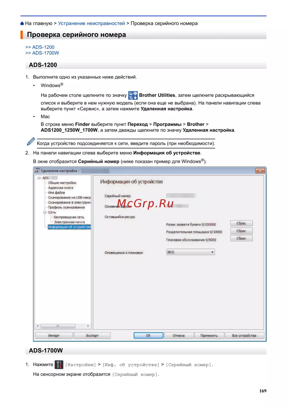 Brother ADS-1200 (ADS1200TC1) — как проверить серийный номер устройства: пошаговая инструкция [173/223]